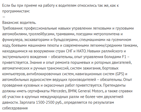 Что ты там про врачей тяфкаешь? Врачи тоже проходят собесы из 15 этапов при наличии уже имеющегося стажа? У медсестры с реальным опытом спрашивают на собесе как ставить укол? Хирургу дают при трудоустройстве "тестовое задание"?