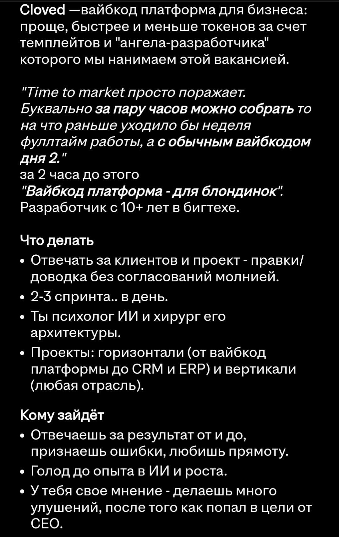 >>3630115 Бля я не верю, это какой-то рофло сайт или кабанчик в маниакальной фазе навайбкодил в lovable такую хуйню, не верю что кто-то там работает реально https://join.cloved.ai/culture