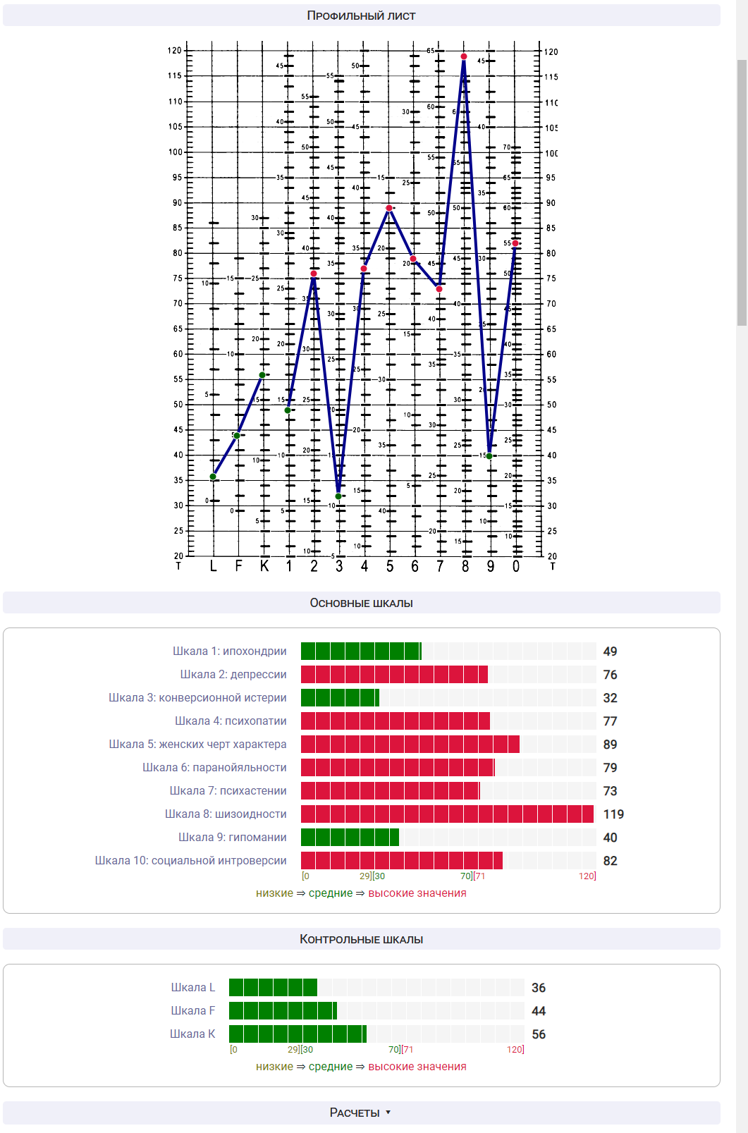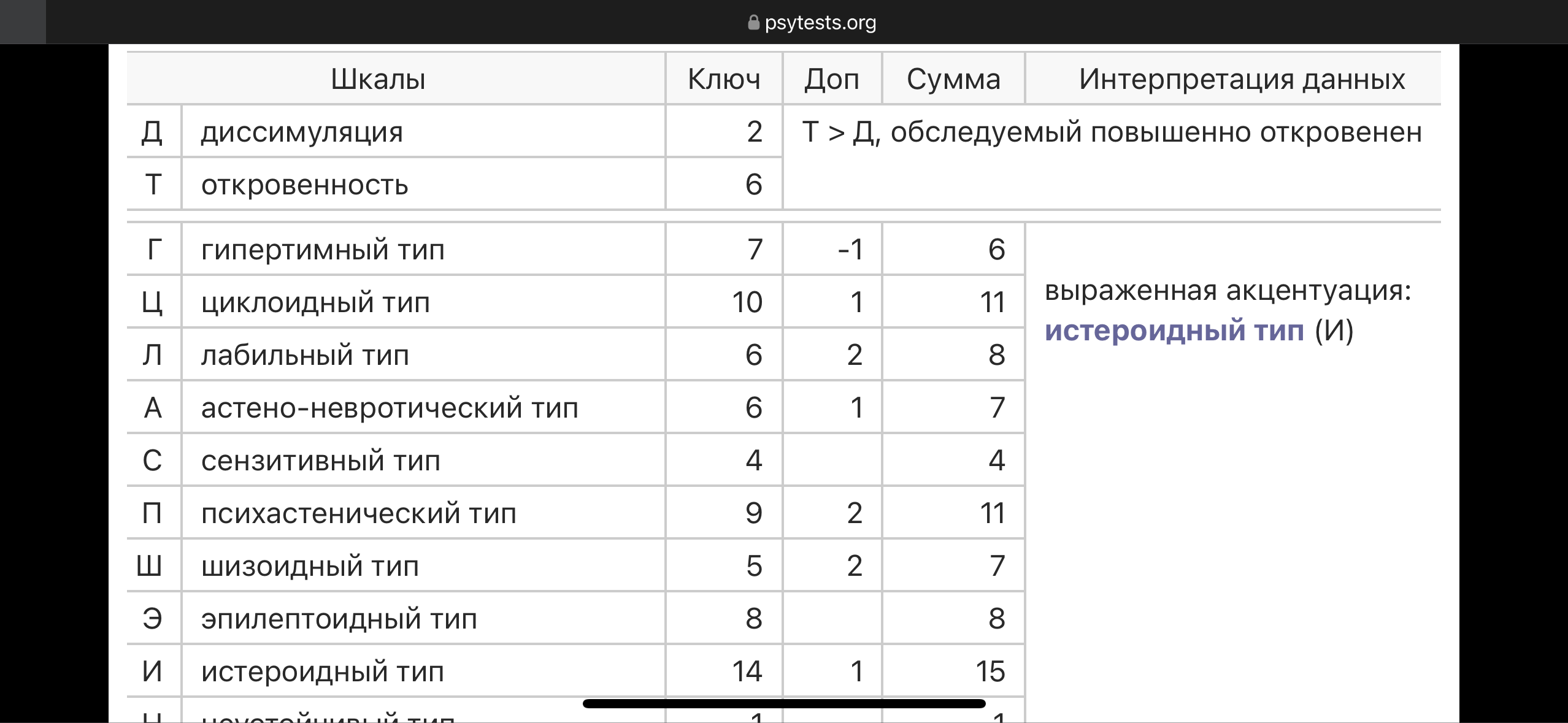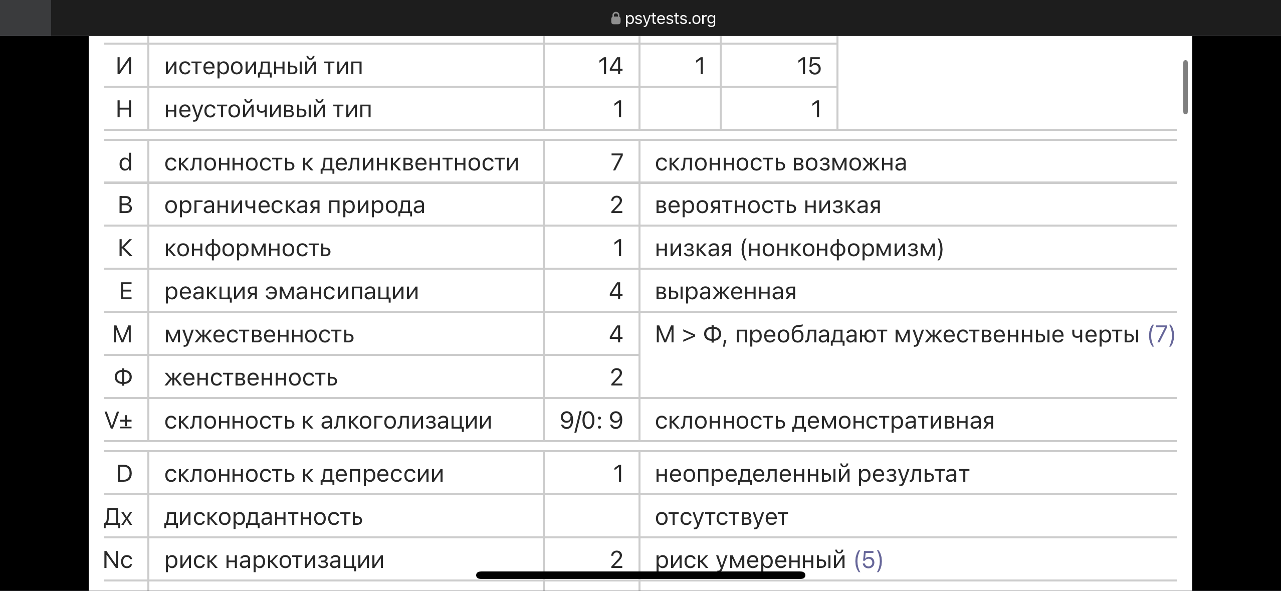 Прохожу каждый год переосвид на группу инвалидности - нужно посещать клинического психолога. Тест всегда обязателен к прохождению и прикладывается к заключению на мсэк. (вместе с результатами метрик на память\внимание\мышление) Собственно поэтому мне и стало интересно - пришел домой с кабинета и прожал всё как в кабинете, так как я честно отвечаю мне и запоминать ничего не пришлось, просто ещё раз ответил на тест и решил узнать что он означает. + как я уже писал я знаю что мисдиагностирован, а меня лет 6 подряд нге слушают по поводу моих доводов к этому. Не то чтобы мне это принципиально было, я хочу другие лекарства, которые мне будут помогать, а не те которые хочется в унитаз слить. вот и всё