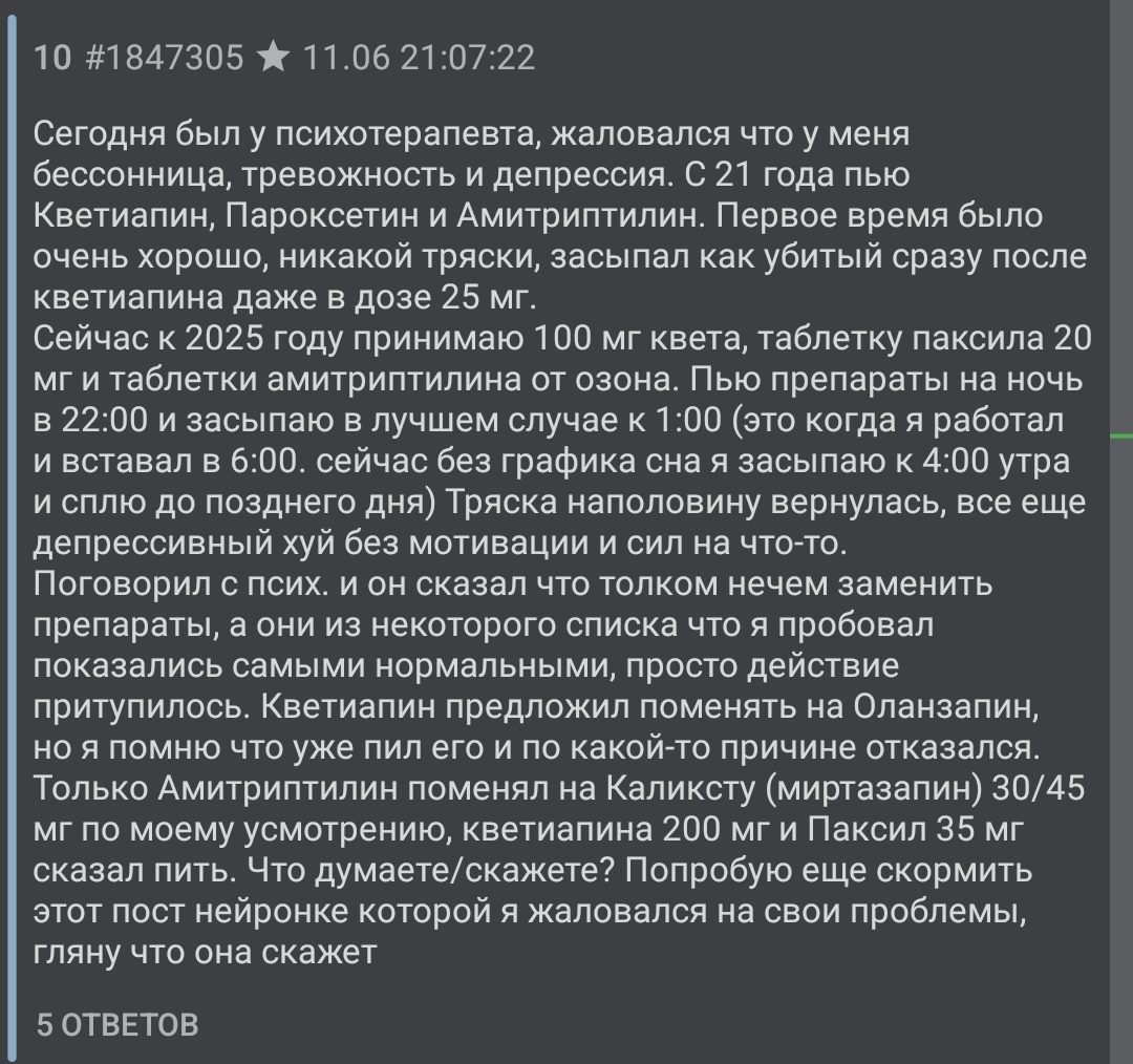 >>1849933 Особо советов мудрых я тебе дать не смогу, скажу только что врач довольно быстро увеличивала мне дозу до 150 мг, буквально за пару недель. Пей перед сном опять же - так легче, по поводу печени я особо не переживаю, так что спокойно иногда побухиваю. А, да, ни в коем блять случае не мешай амитриптилин ни с алкоголем, ни с габой - тебя гарантированно уложит как слона причем в делирии с чем-то похожим на грезы, где угодно - едешь ты в автобусе, ходишь по тц или сидишь на остановке. Кофе его очень слабо контрит, так что опять же. Напоследок скажу, что эффект того стоит, кто бы что ни говорил, а дичайшую тревожность и зажимы в груди он мне убрал наотлично, временами эффект вообще походит на прегабалин по степени анксиолитического эффекта.