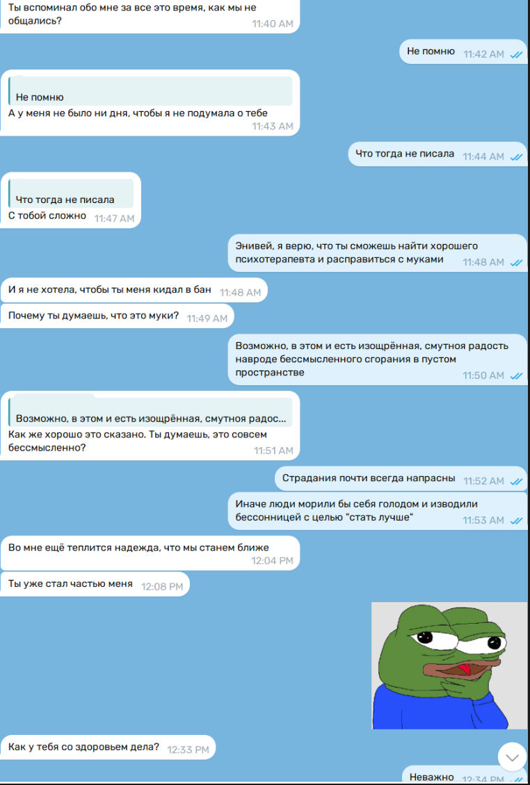 Вчера вечером представил: если бы нас переводили из треда в тред, как из отделения в отделение. Вася: ты отправляешься в тред шизоидов. В детском саду такое было, меня швыряли из группы в группу, я боялся ровесников и воспитателей и каждый раз ужасно плакал.