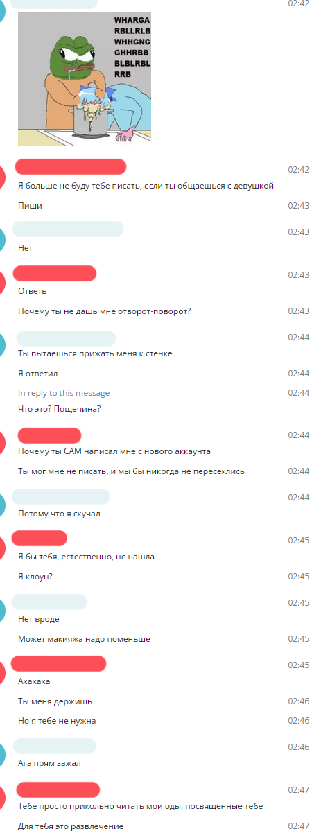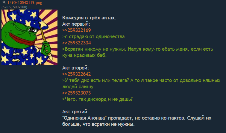 > Один хуй решиться что-то им написать самому не могу А что писать? Тебя за любое задоксят, засплетничают, засмеют. "Привет" - банально. "Как твой день, о ангел ночи" - ты кто. "Давай познакомимся" - ты что, изврат.