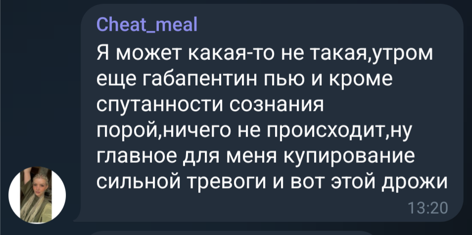 Вчера я кринж словил когда бабуся в аптеке просила аптекаря продать ей габапентин. Говорит, ох, худо мне худо, привыкла к нему, дай пачечку или две мне.