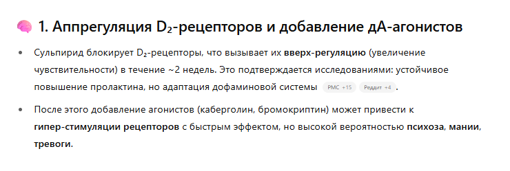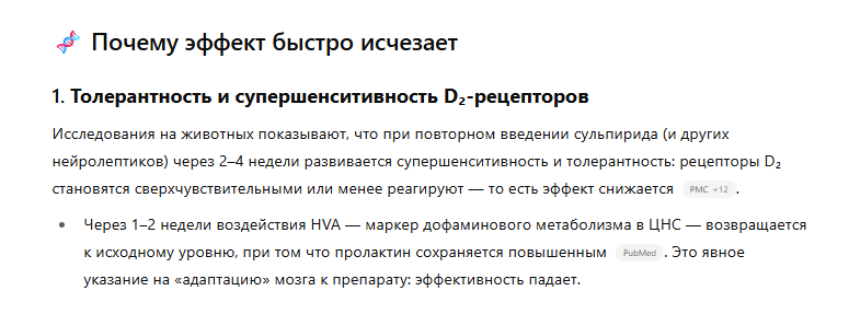 >>1861666 Надо будет изучить почему Сульпирид и его производные так быстро толерятся. Могу предположить, что антагонизм к Д рецепторам вызывает быстрый прирост пролактина, кидающий нормисов в максимальную апатию.