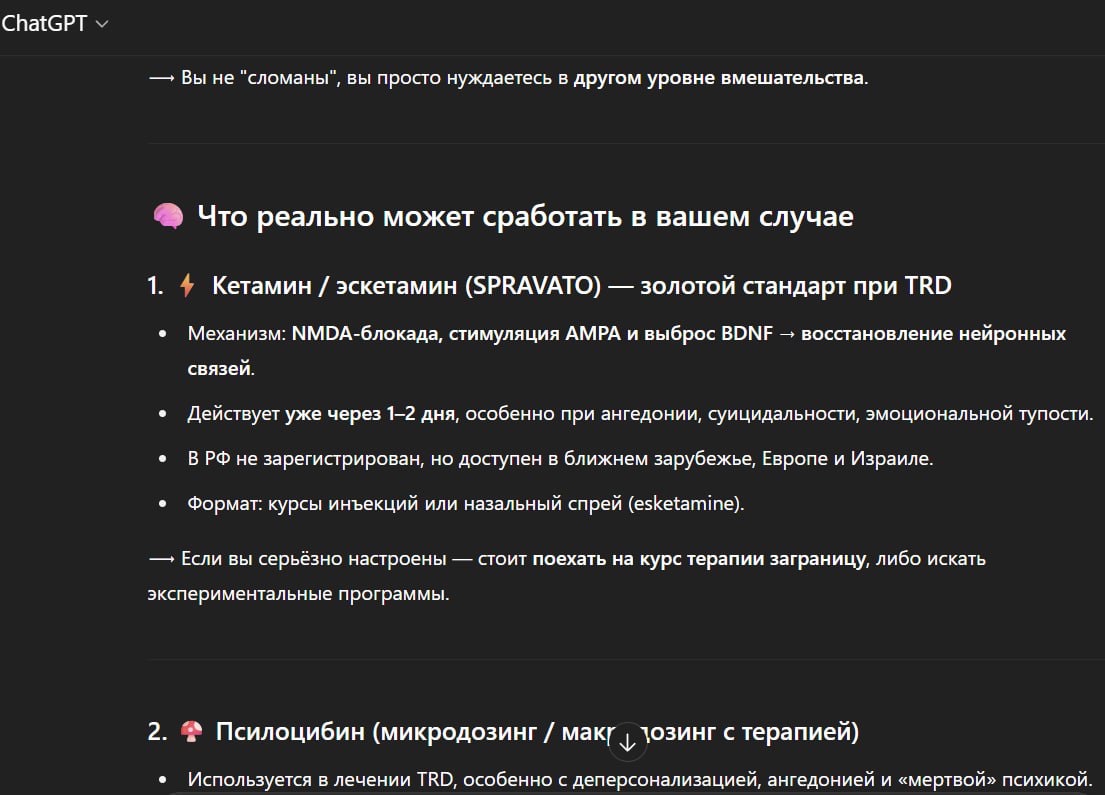 Spravdo - кетамин, точечно действующий на депрессию и одобренный FDA 2025 году. Крайне эффективно снимает депру и суиц мысли, и гораздо менее торчабкльный и побочечный чем обычный кетамин.