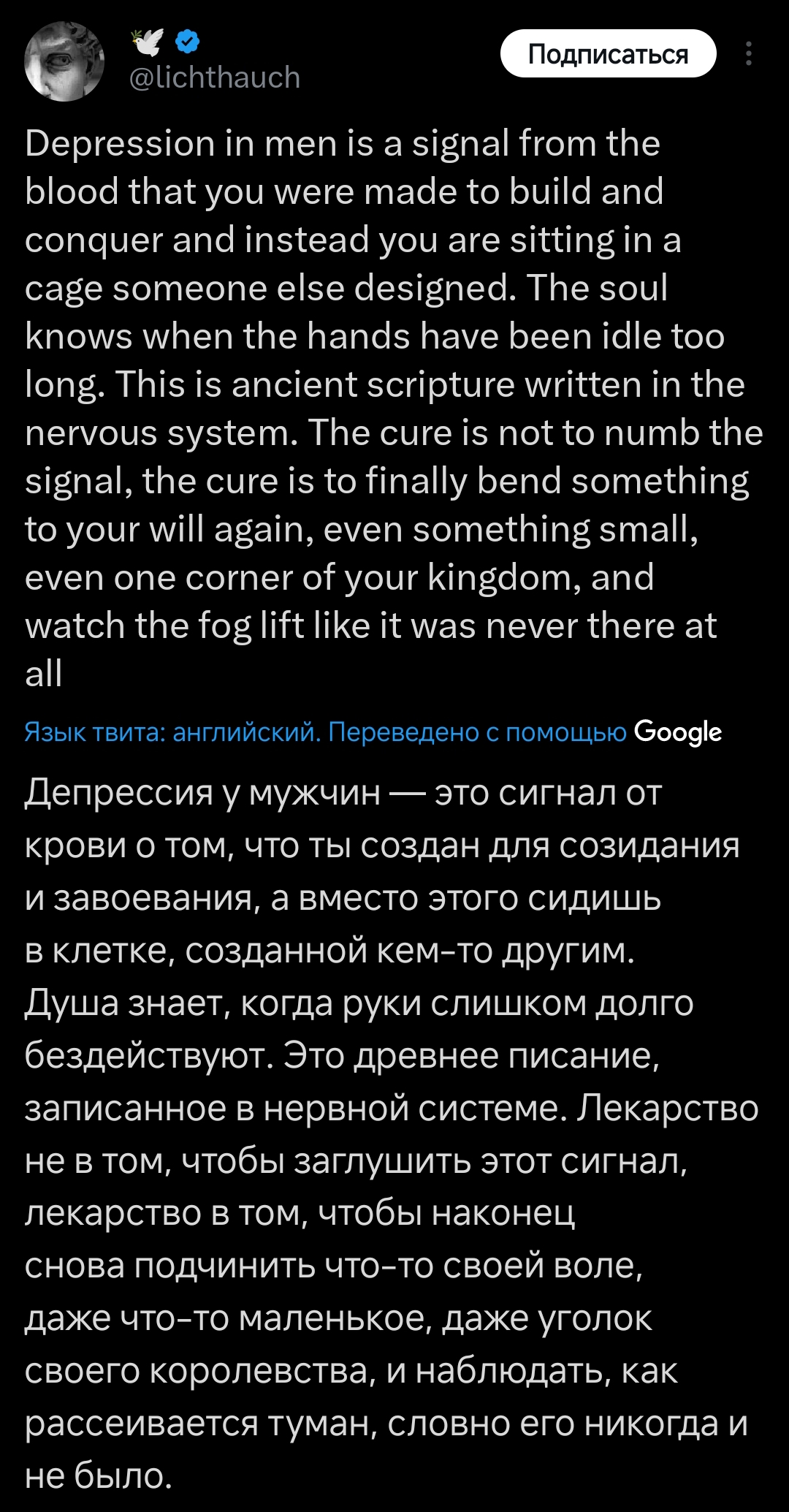 >Не хочется ничего, работать впадлу (рабоьал на 3 говноработах пару лет за жизнь и все), потреблять калтент уже заебся, все эти стримеры и ютуберы тьфу на них блять. Посмотрел в последние дни парочку фильмов, которые занес в вишлист на летербоксе и все.... Игры не вставляют никак. Инстаграм тоже заебал. Тоже самое было, все заебало полностью и ничего не было интересно + еще сил не было постоянно и энергии, также режим сна конченный был и не восстанавливался, после лечения это все прошло и я начал опять кайфовать от игр, наладил связи с старыми друзьями, теперь почти каждые выходные собираемся.