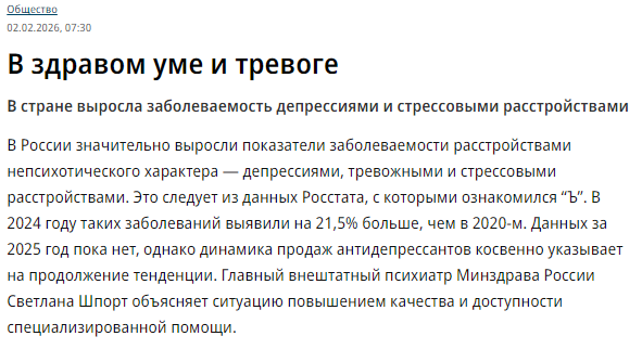 Считаю депрессия не психиатрическая болезнь, а неврологическая. От переутомления телесного и физического, от агрессивной соц среды, повесточки и мировых событий. Тебе тяжело ты не справляешься, тебе говорят ну выпей кофе, бахни пивка и тд, простимулируся, замотивируйся, а человек это не машина, нельзя просто пшикнуть эфиром как в двс и поехать. А вот вроде ты привык работать, еще дела делать и тд, а мощность падает, нервная система деградирует, мозг портится. И человек пьет кофе, ищет мотивацию, может что-то еще бахает, и все сил нет, энергии нет, ресурс нервной системы исчерпан. И привет депрессия. Где я ошибся в своих рассуждениях? И как антидепрессанты по сути тоже стимуляторы нейрометаболизма должны помогать от усталости?