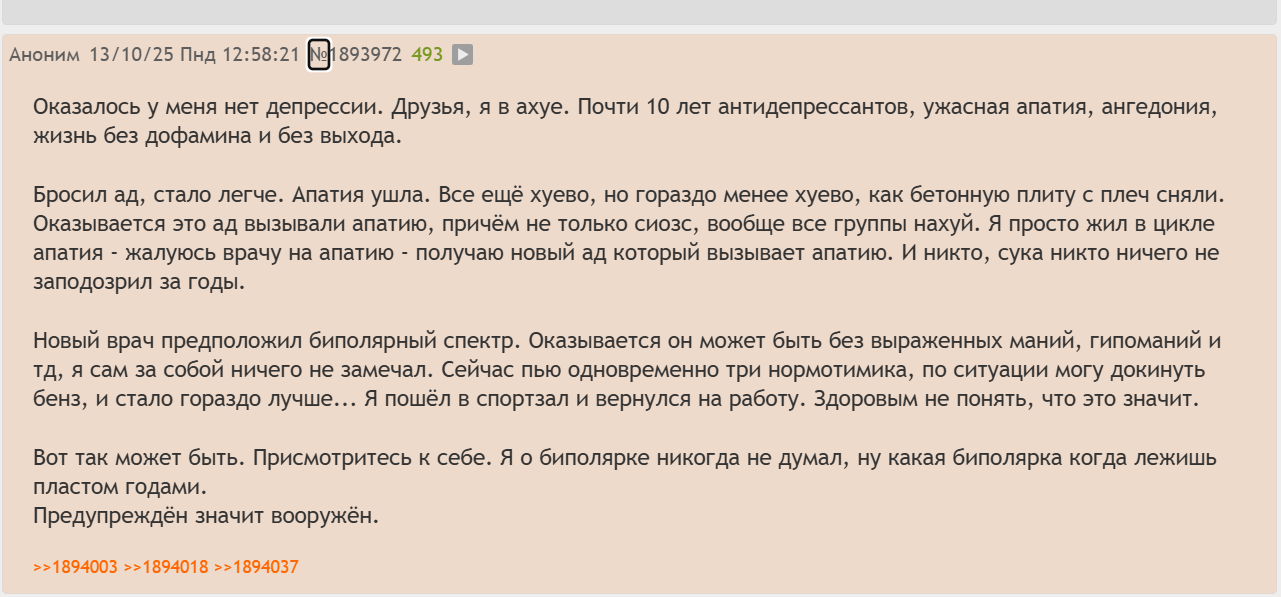 >>1894461 >Я тебе еще не рассказывал про то, что они могут говорить одно а писать в карте другое. Например говорят тревожно-депресивное, лепят в карту Истерическое. Говорят ОКР и лепят в карту шизоидное под вопросом. Ты просто после такого даже СЛОВАМ не можешь доверять. Хочется просто иногда идти в регистратуру и просить карту чтоб посмотреть что про тебя действительно написали и ОТ ЧЕГО тебя лечат или не лечат Лол. Пошел к врачуху, чтобы вылечить окр - в итоге, волучил сверху целый самосвал тревог, перепроверок и ритуалов. Белиссимо.