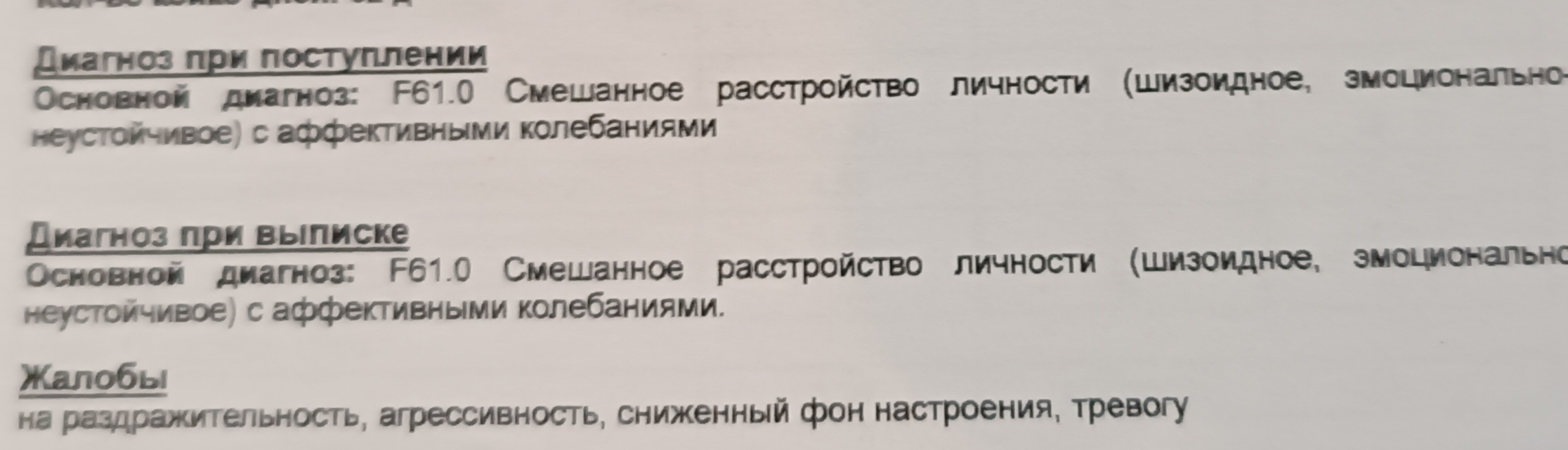 Как сказал доктер, на ПРЛ указывает расщеп приличный, в целом мыслю дихотомиями по отношению к себе, к другим - меньше. страх одиночества, ощущение пустоты и сложности с определением своего я, сдавал ЭПО. Так что вроде можно поверить. А так почти семь лет с реккурентной депрой, дистимией, че там ещё ставили, ГТР + ДРЛ, с дурки в целом с тревожно-депрессивным вышел