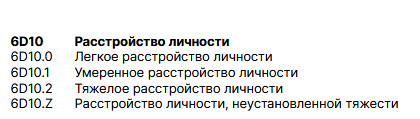 6D11.5: Данный указатель может быть применен в отношении лиц, личностные нарушения у которых характеризуются тотальным проявлением нестабильности межличностных отношений, образа себя и эмоциональных состояний, а также выраженной импульсивностью, на что указывают многие из следующих признаков: непереносимость реального или воображаемого отказа; паттерн нестабильных и эмоционально насыщенных межличностных отношений; нарушение личностной идентичности, проявляющееся в стойко выраженном нестабильном образе себя или чувстве собственного «Я»; склонность действовать опрометчиво в состоянии сильного негативного аффекта, что может приводить к потенциально саморазрушающему поведению; повторяющиеся эпизоды самоповреждения; эмоциональная нестабильность из-за выраженной реактивности настроения; хроническое чувство пустоты; неадекватный интенсивный гнев или трудности с контролем гнева: преходящие диссоциативные симптомы или сходные с психотическими проявления в ситуациях повышенного эмоционального возбуждения.