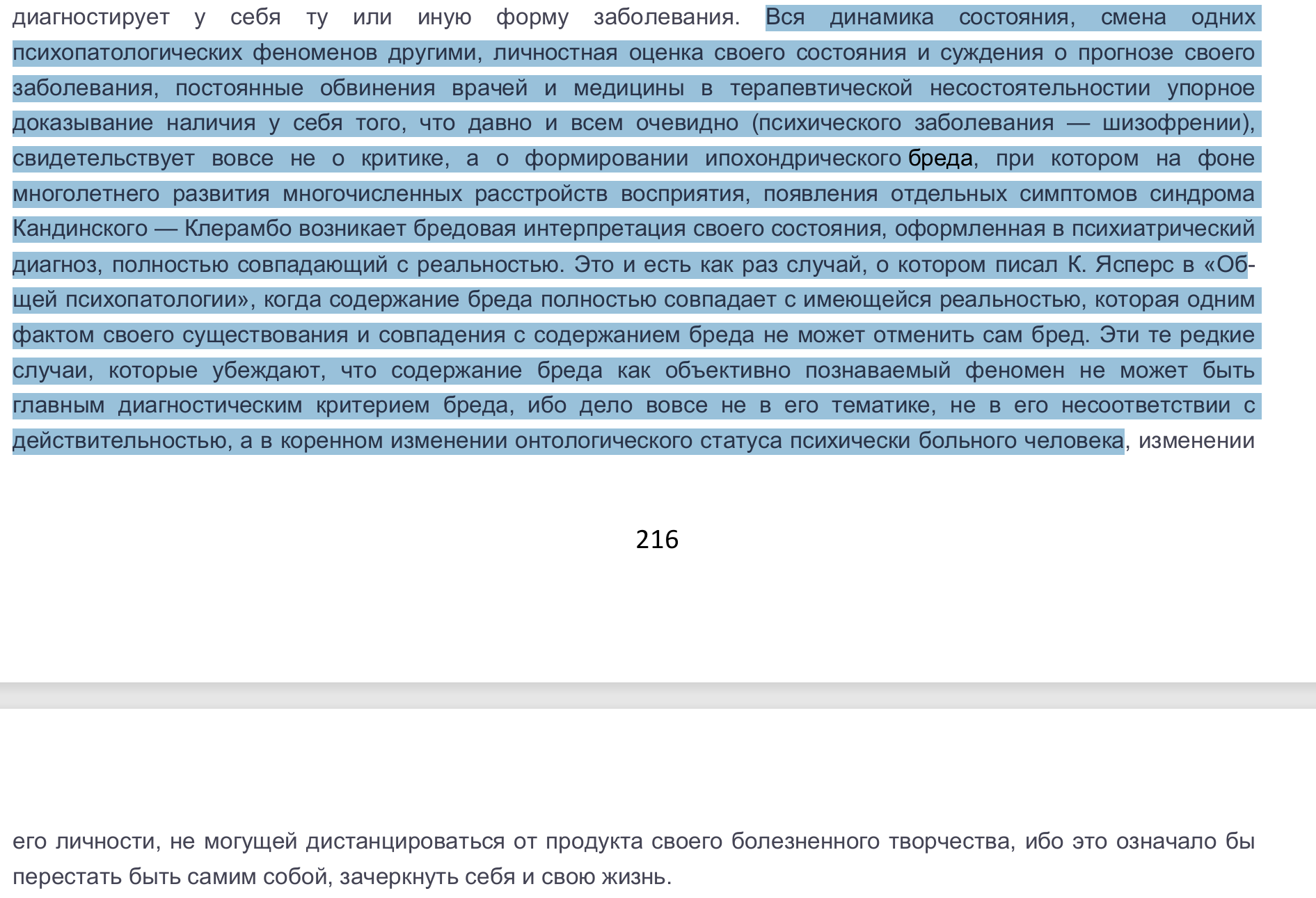 Например я помню, как врач говорил мне что шизофреник не может знать пока он шизофреник пока ему не сказали. И это меня успокоило. А потом что я вижу? Медецинский разбор случая где шизофреник не только сказал, что он шизофреник но и СФОРМИРОВАЛ БРЕД ОБ ЭТОМ. Я не спал после этого случая где-то три дня, пока не обратился к психу и не принёс медкарту, говоря что-то в духе "вот видите, я приношу вам медкарту абсурдного случая... который случился один раз за все 100500 лет... не значит ли это что я ищу валидацию своего бреда? Ведь я же как нормальный человек не мог спокойно посидеть дома, и не думтать об этом. Нет! Мне надо поднять эту тему."