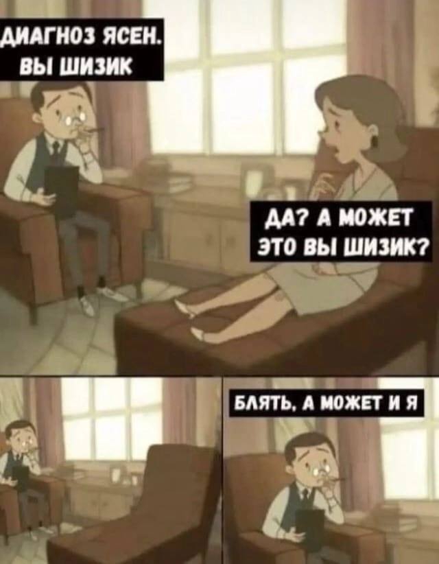 Парни, это опять я >>1873413 → Ну, типа, посмотрел видосы, почитал что-то и это литералли ми получается. Хамелеон, проблемы с нормальной работой, привязка к человеку, резкое убегание от ответственности/человека. А чо делать-то с этим? Идти в дурку и подтвердить или опровергнуть диагноз? А зачем? По самоучителю из шапки попытаться себя вылечить? Но мне и так хорошо, как я это изнутри чувствую. Типа, врач даст справку, что я психопат и мне скидка на жку выйдет?