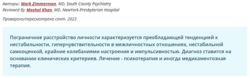 >>1879856 А я не знаю, мне в 21 год поставили диагноз-помойку "тревожное расстройство", но у меня тогда практически нулевой опыт отношений был и сам понимаешь Ну и я достаточно эмпатичен (хотя скорее потому что это выгодно мне поначалу) + знакомая пограничница говорит, что не не похож, потому что обычно пограничники расписные капец, а я чета нет, с другой стороны - я тут же вроде читал что расписные прл прост на виду потому что ну бля заметные и их девиантное поведение больше на других нацелено и все такое, а по-хорошему у прл тоже ну нет типов как у бар, но подтипы явно есть