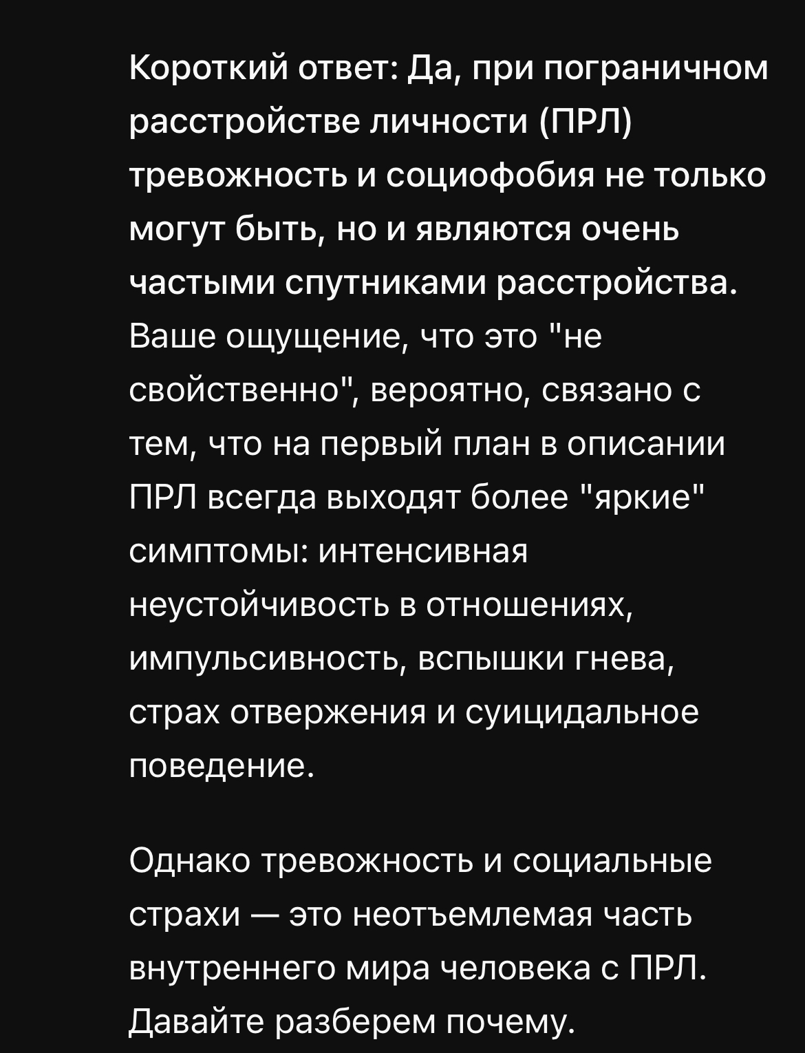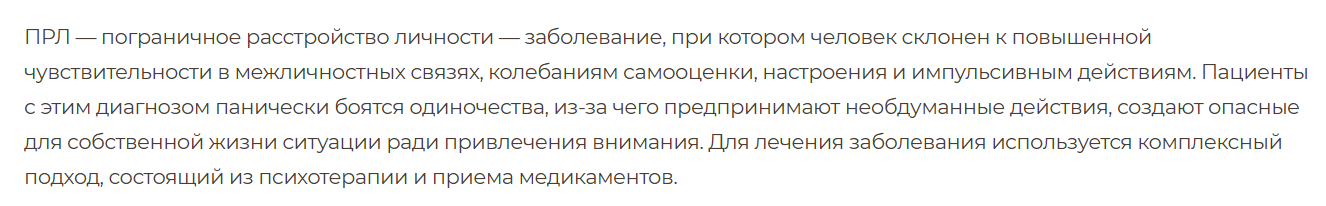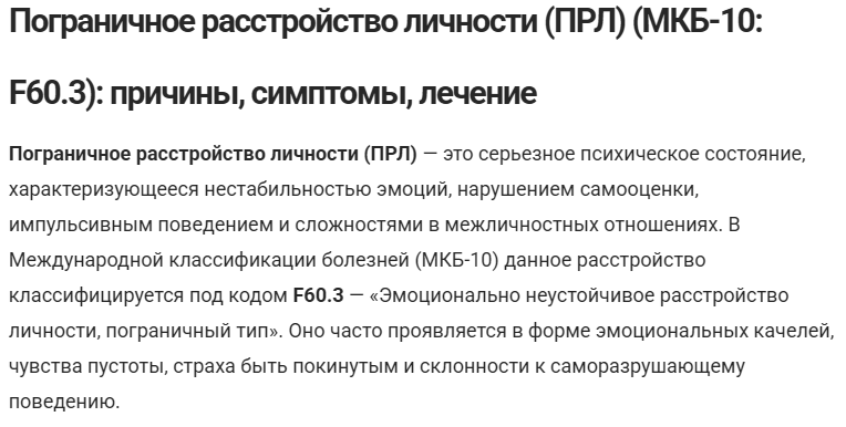 Но когда я искал инфу про ПРЛ - не мог сказать что это про меня, так как 70% этого расстройства попадание в точку в меня, но 30% - наоборот взаимоисключающие со мной понятия.