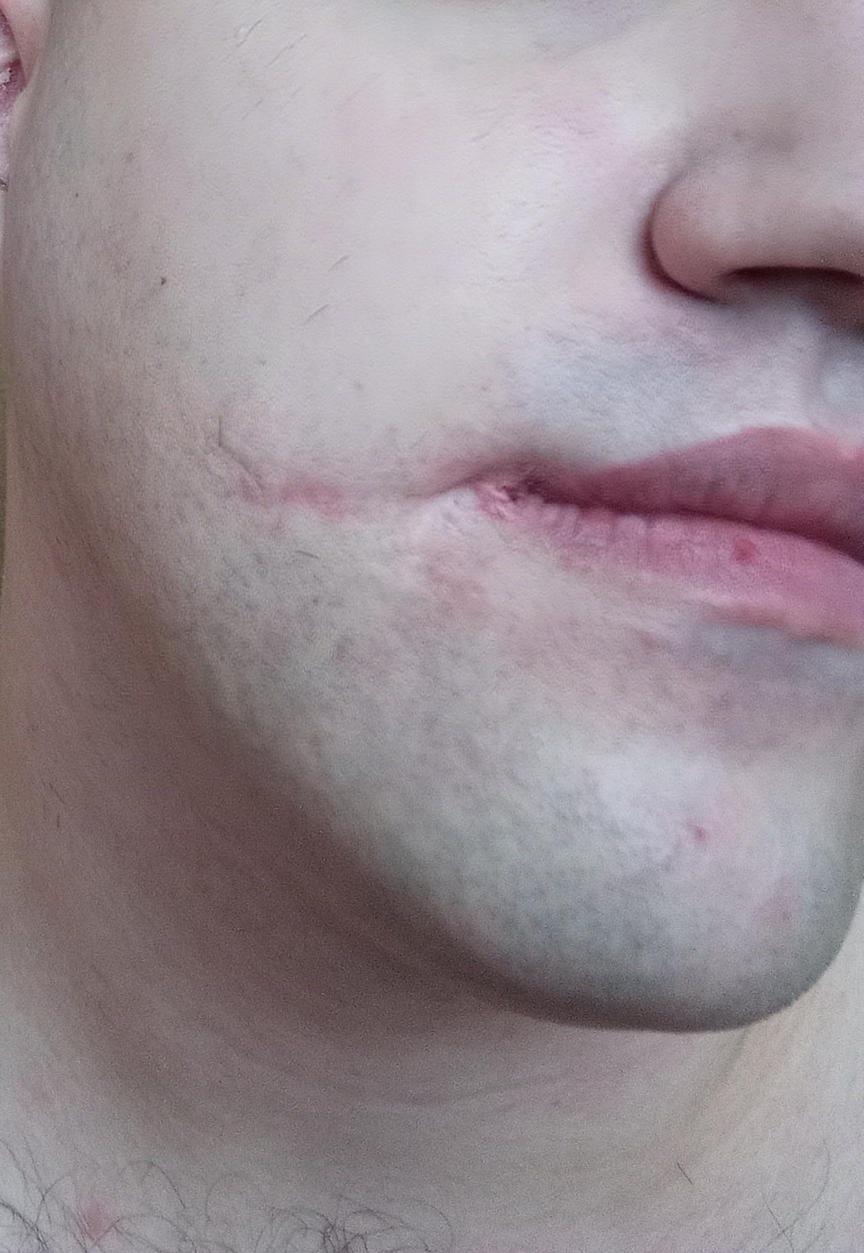если б внатуре порезал щёку как слайсик с угла рта и вглубь щеки, как это и задумано - норм было бы и шрам бы пугающий действительно был бы, а так наверное приходится уточнять и намекать что это ты сам себя порезал, чтоб понятно было