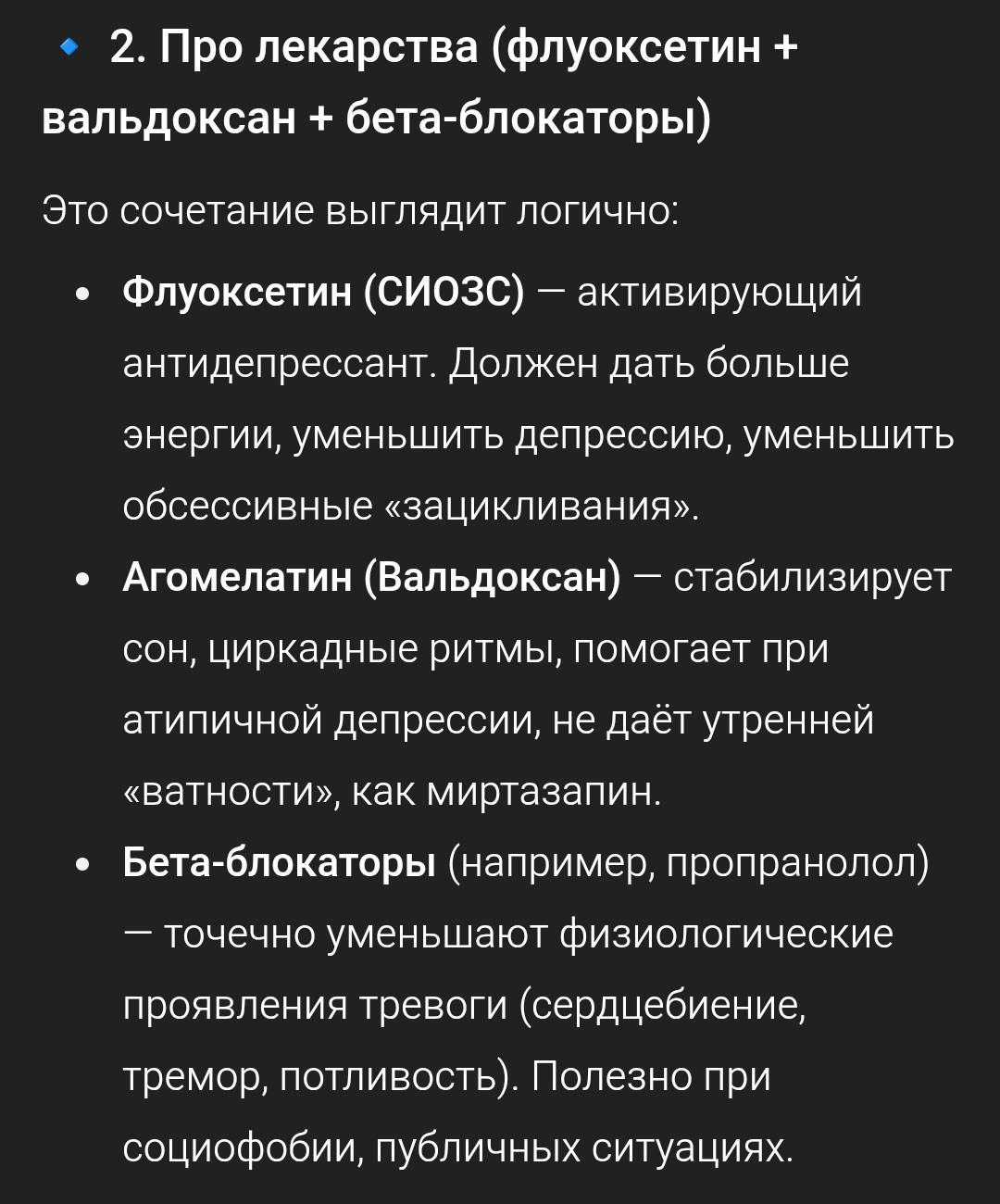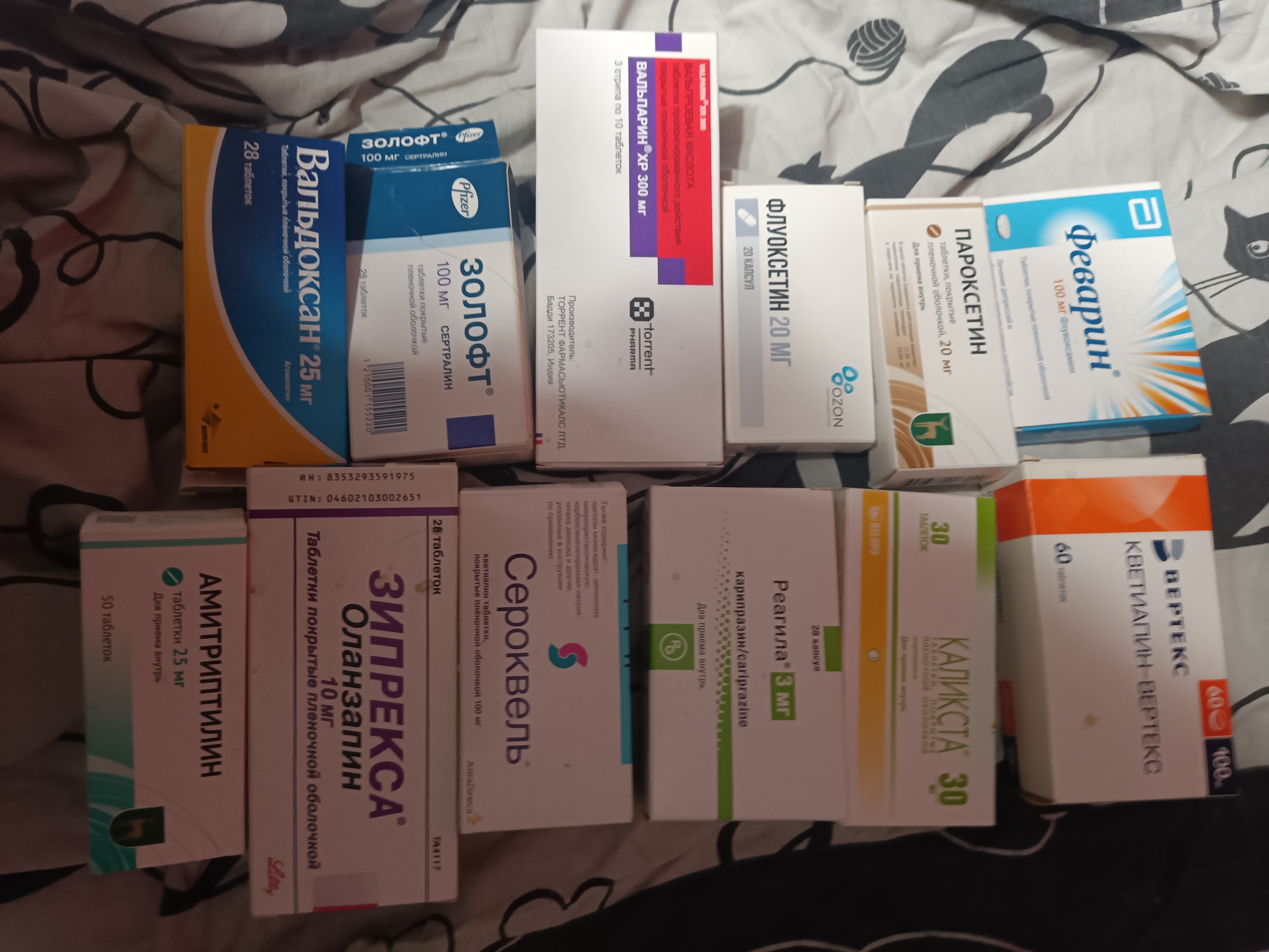 Что думаете? Пью сейчас кветиапин + паксил + миртазапин. Надоело что у меня нет сил, вкуса к жизни. Тревожность все еще ебашит когда выхожу из дома. Наел вес на таблетках. Сейчас хочу похудеть, но нет сил и мотивации. Лежу мешком на кровати и ничего не делаю, нет интереса ни к чему, еще и тревога добивает от занятий чем-то. Хочу перейти на флуоксетин + вальдоксан + бета блокаторв. Чтобы появились силы, флуо помог бы с диетой. Из минусов это плохое купирование тревоги чем на паксиле + когда ты заседатирован, но я и так тревожусь блядь. На улице боюсь на людей смотреть или что они доебутся. Короче хочу из депрессняка чут чут вылезти и чтобы возможно? я снова начал удовольствие от жизни получать, анимцо смотреть, в игры играть?? а не вот серый фон вот этот. Ну и еще минус могут вернуться эмоциональные качели. И действия на импульсах. Еще сон может по пизде пойти снова конечно... Еще надеюсь что появятся силы чтобы я начал углубляться в психотерапию и всякими кпт заниматься. Либо самостоятельно, либо может найду психотерапевта для такого?
