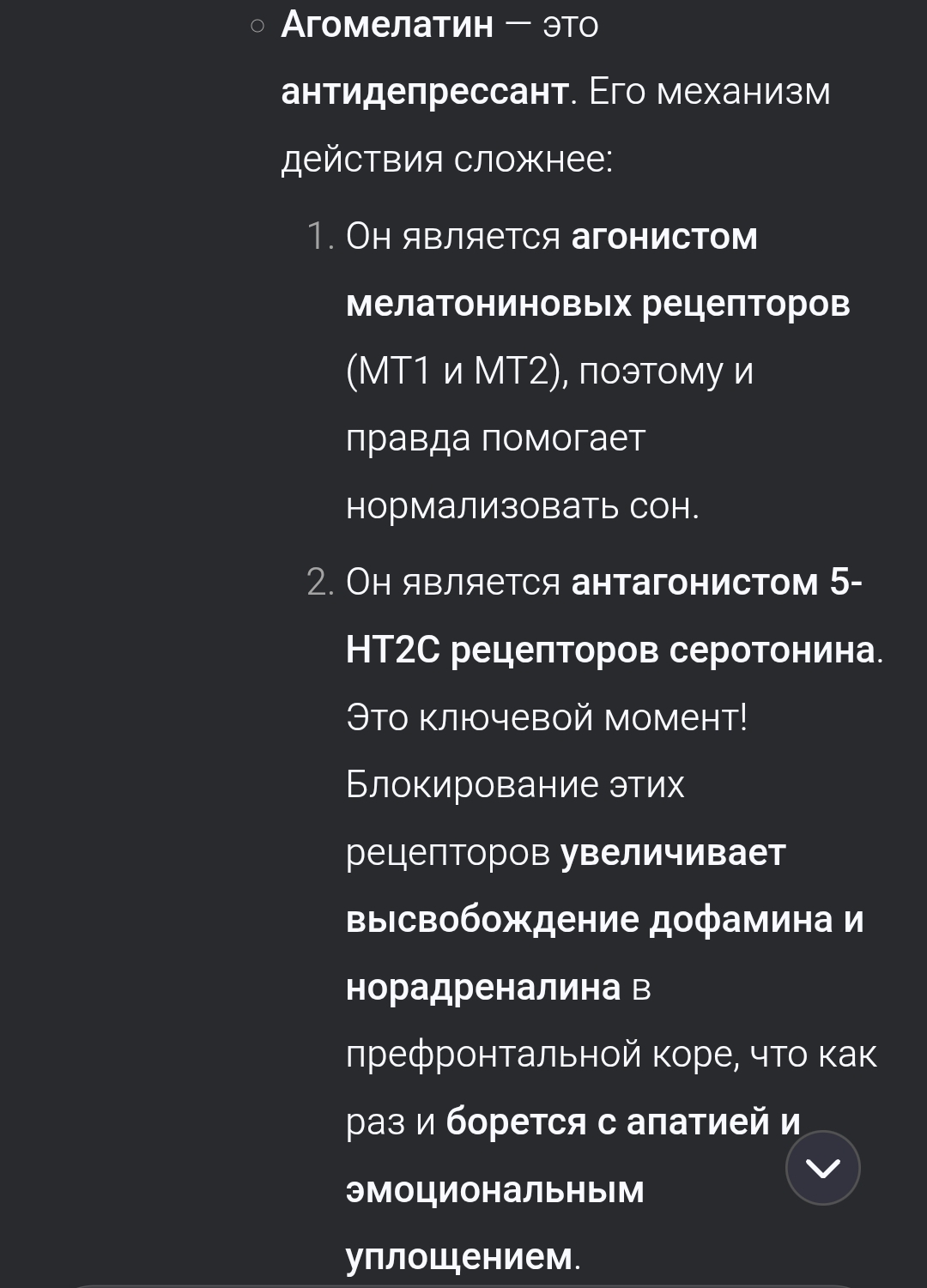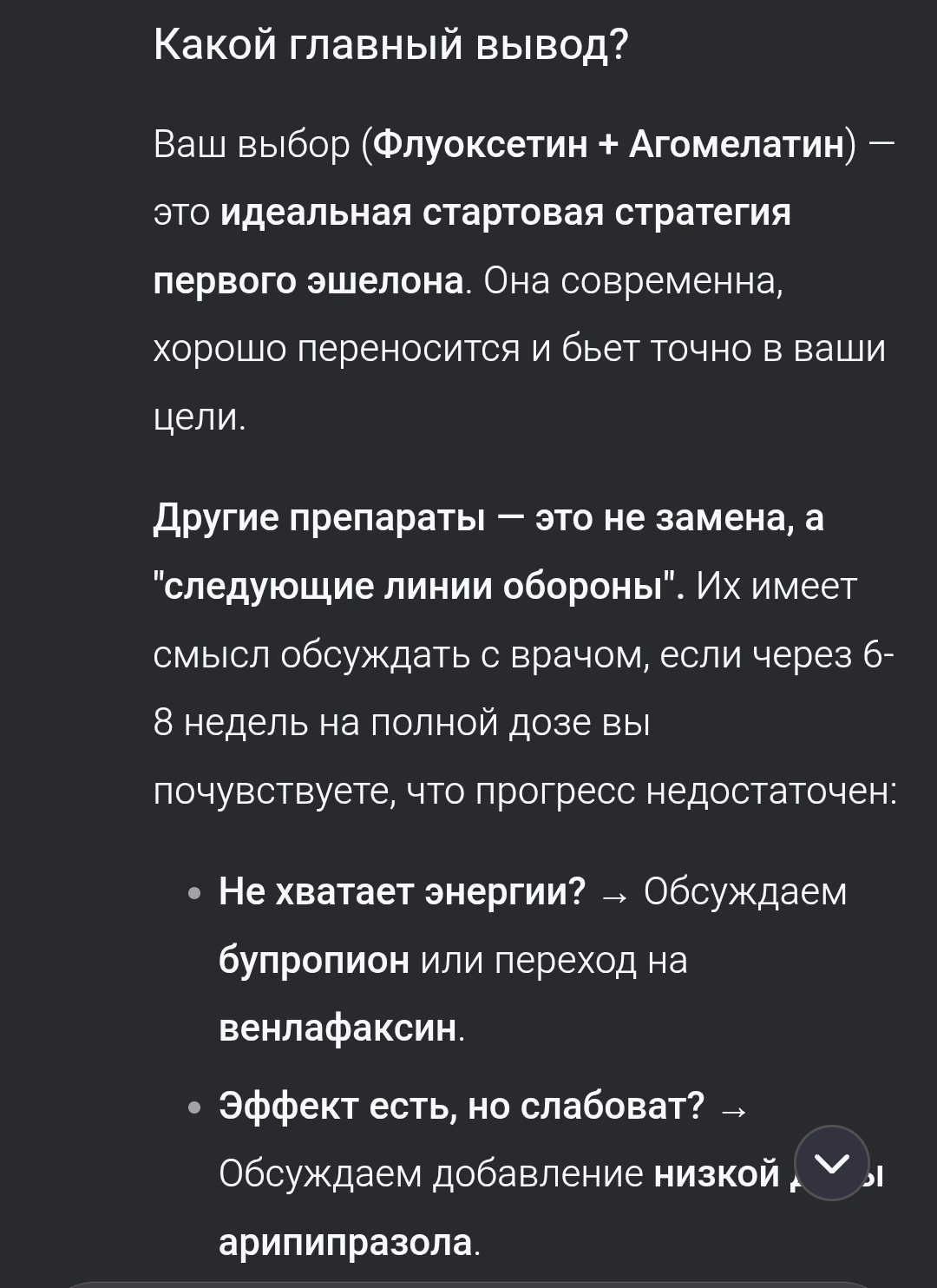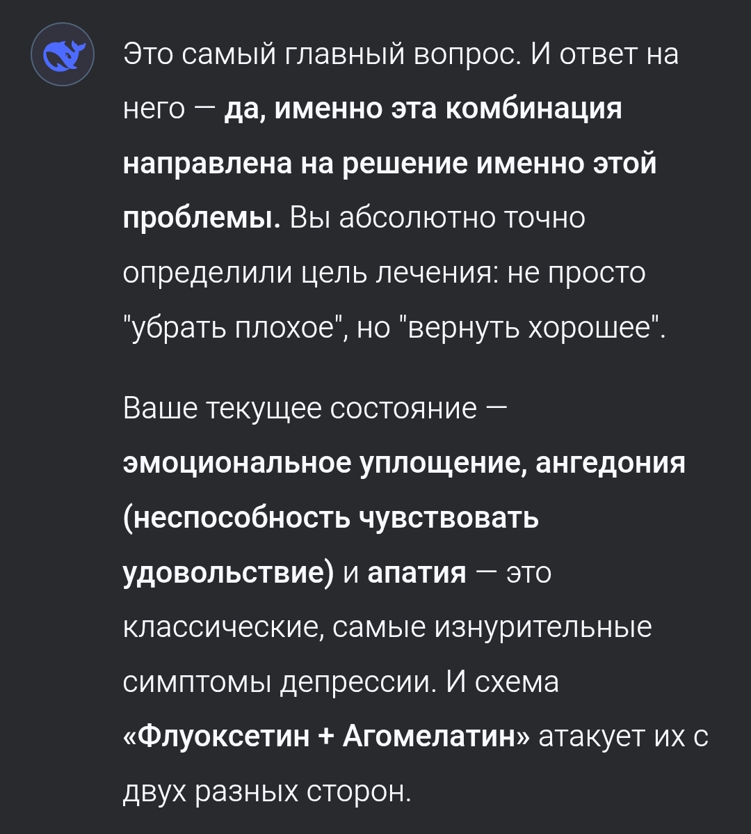 >>1880198 > нейросети это последнее, что стоит слушать по поводу подбора терапии А что тогда делать? Тут сидят торчебосы в основном, либо впадлу людям писать. Но я понимаю, мне бы тоже было похуй, но че тогда читать? Как разбираться в сабже. Да и сил нет. Когнитивка на нуле. Нейронка легкий вариант хоть с кем-то обсудить проблемы. Когда прихожу к психотерапевту сразу сковывает и я ни бе ни ме, че спросить не знаю, он тоже не развивает диалог. Что предложить ему тем более хз. А он как-то поверхностно ко всему относится, не знаю. Надо что-то иметь заранее чтобы я пришел и предложил какие-то таблетки и обсудил их > Агомелатин это вообще ребрендинг мелатонин, а флуоксетин даже в теории не может помочь от апатии и тем более эмоц.уплощения, ведь ОН ИХ ВЫЗЫВАЕТ Пикрил. Насчёт мелатонина, мне нейронка и советует сменить миртазапин/квет на что-то что влияет на циркадные ритмы. Потому что эти препараты меня жестко вырубают и не помогают режим наладить. Когда я пропускаю прием то все, бессонная ночь, сплю днем. Плюс квет уже на толере и хуже работает. Ну и я хочу уйти от препаратов с побочкой в виде лишнего веса