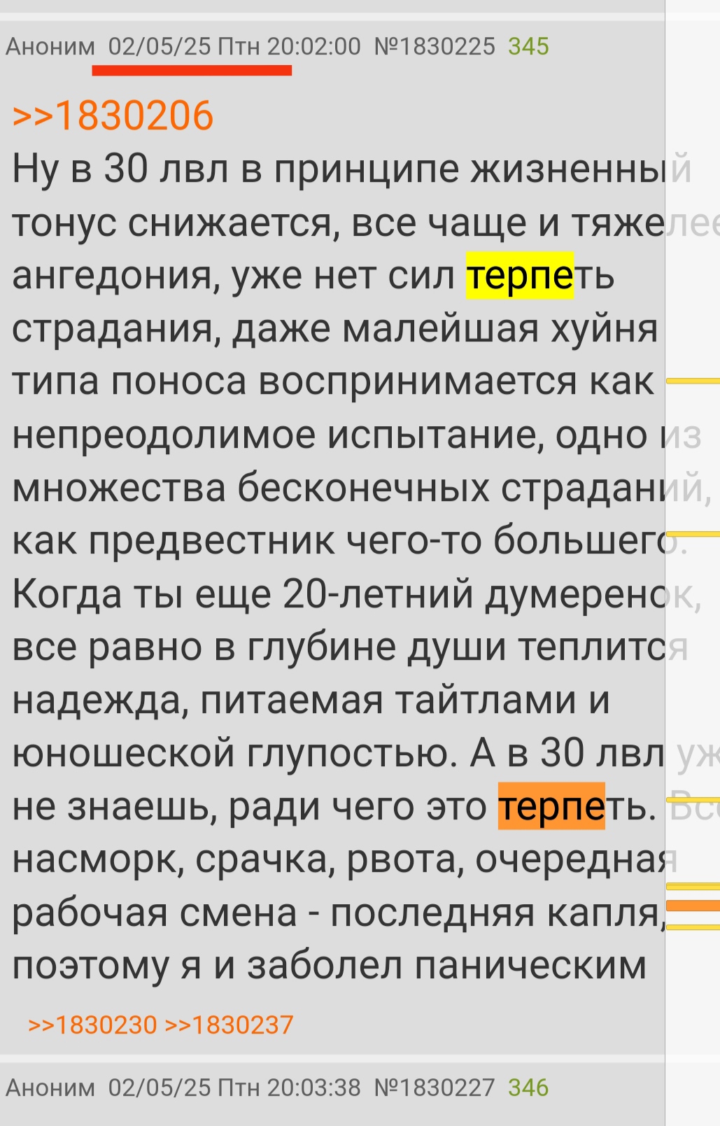 >>1879952 У меня падает концентрация, плывет по бокам зрения. Тревожные мысли одна за одной, воспоминания, вызывающие стыд и вину, впе это перерастает в страх, отдающий в животе. Я начинаю потеть, пульс бьется сильно. И так 6 часов где-то, с 18 лет регулярно, раньше каждый день. Спасался от этого раньше коктейлем водка, клозапин, аминазин. Потом всякие транки покупал кладами. Ща снимаю кветиапином.
