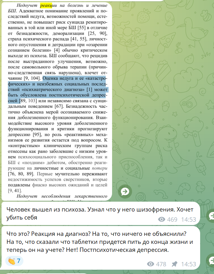 Больше всего бесит, что в этих же документах, когда человеку например сообщают диагноз Шизы и он под тяжестью стигмы самоубиться, эти умники говорят, что это не из-за стигмы и учета. Нет. Это ШИЗОФРЕНИЧЕСКАЯ ПОСТПСИХОТИЧЕСКАЯ ДЕПРЕССИЯ ИСКАЗИЛА ЛОГИКУ! На самом деле... а мы не знаем как на самом деле. Но если человек хочет от диагноза в духе рака, шизофрении, и прочей хуйни выйти в окно вместо того, чтобы принять его, то это патология!