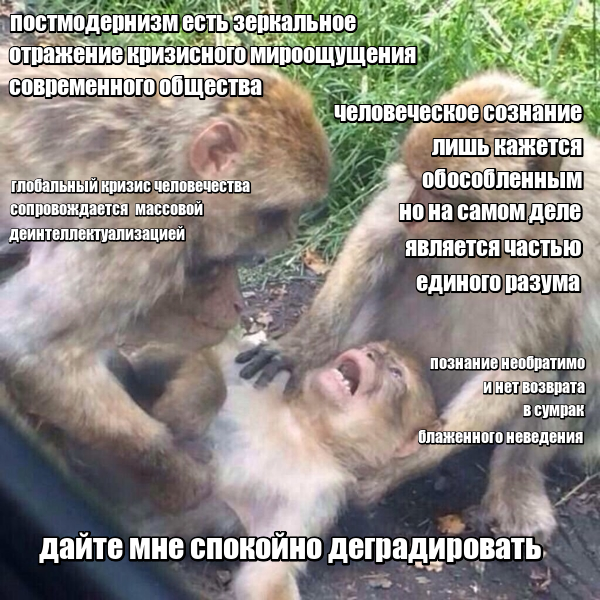 >>1887565 Постмодерн никому не нравится, бро. Но от него никуда не денешься, не спрячешься. Стоит только на секунду забыть про постмодерн, и вот, ты уже нихуя не можешь понять что за хуйня вокруг? почему все ебанутые? Единственный способ коупить это - самому стать постмодернистом, вписаться в систему. Вот тут и проявляется конфликт шизоида с социумом. Но даже будучи шизоидом приходится сосуществовать с реальностью, а потому постмодерн это уже классика, это знать надо.