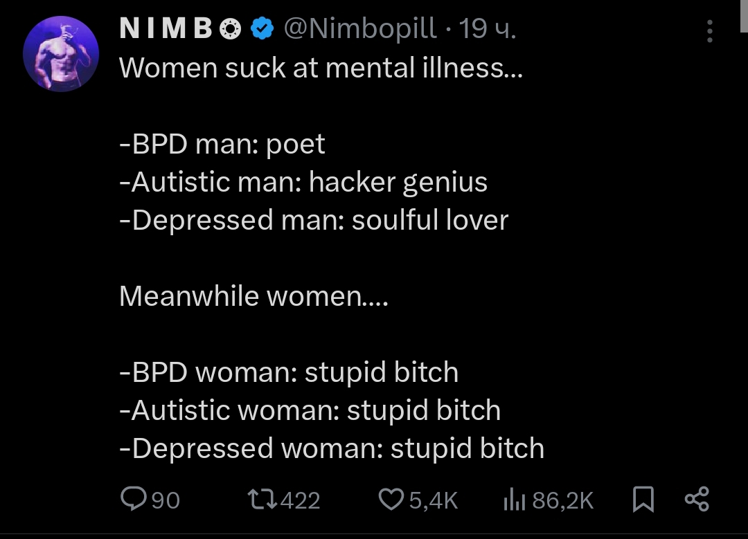 > Как итог у ребенка паталогическое чувство вины, паталогическая угодливость, склонность к слиянию, чтобы быть незаметным. Близко общалсч с несколькими тянками, у которых мать как ты описываешь, вот с классическими битардскими историями. Но НИ У ОДНОЙ не было никогда никаких вины и угодливости (которые часто женщине к лицу), напротив, они обросли пороками, взяли от обеих полов всё самое худшее. Где ты вообще видел тян в 2025 которая в принципе способна испытывать вину и угождать? То, что ты описываешь, это чисто мужская проблема, -- женщин же это ведёт всегда к одному (пик4)