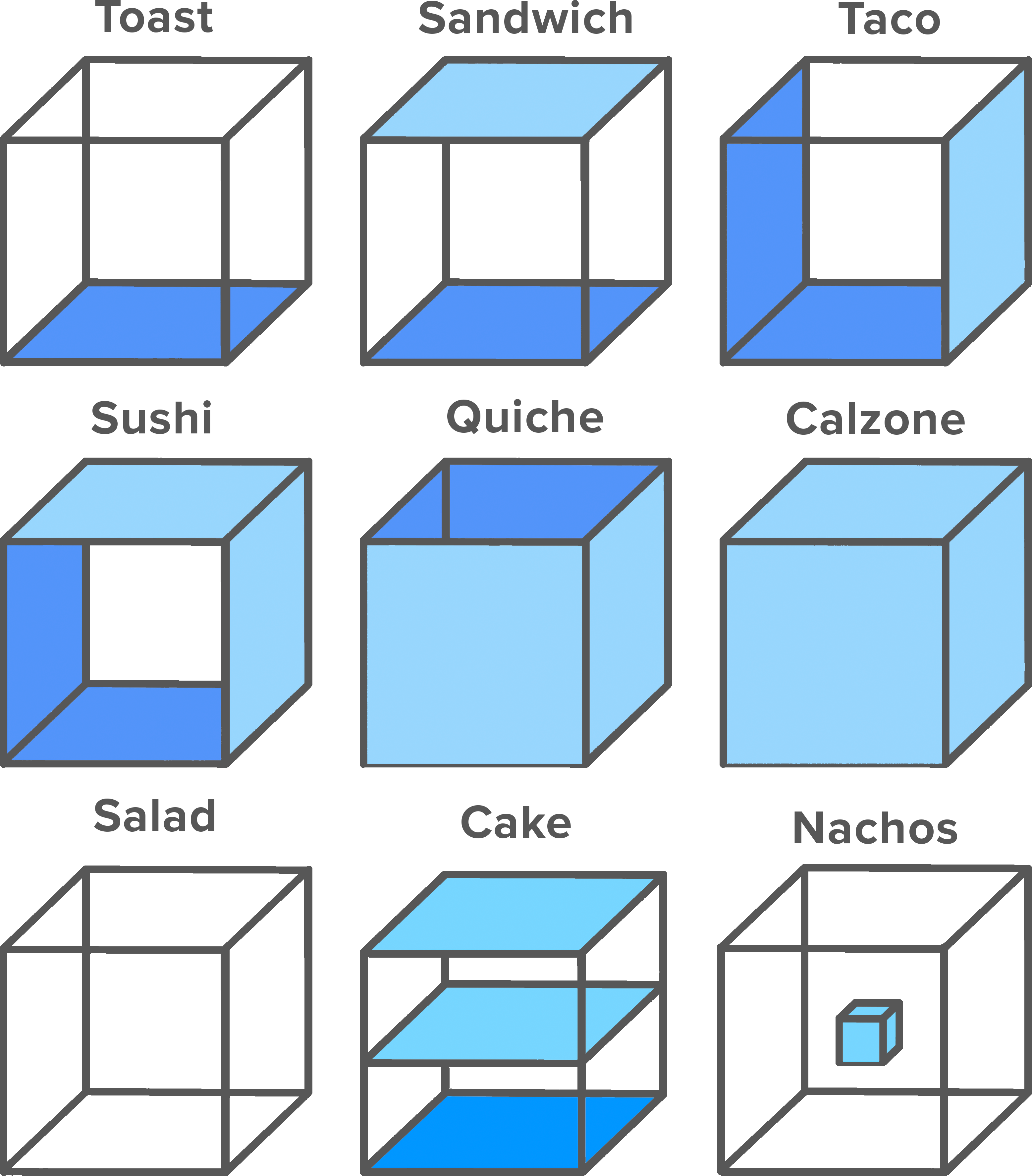 >>1900376 правило куба простыми словами: условная пицца\хотдог\шаверма\сэндвич - всё одно и то же структурно, но с разным формфактором, это всё можно под одно слово-категорию подвести в контексте формы и сборки