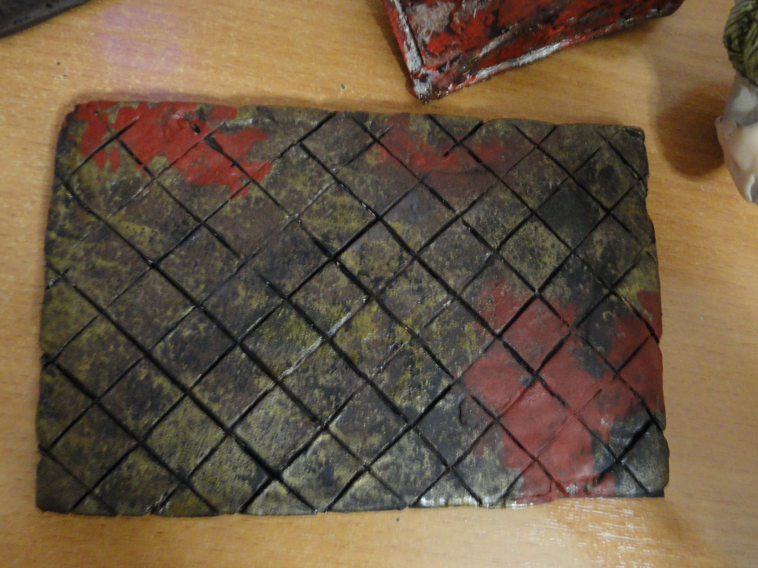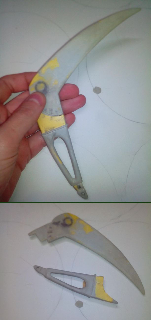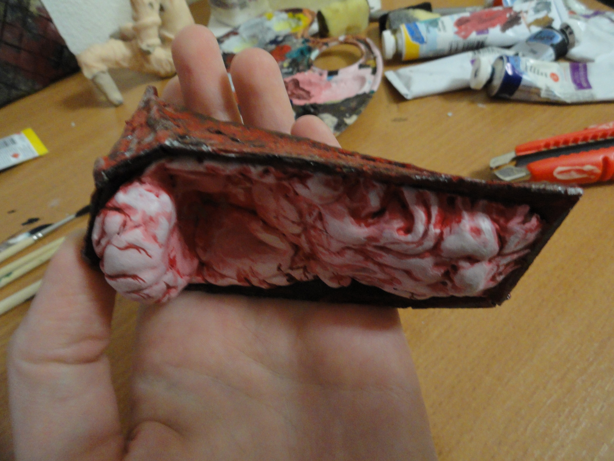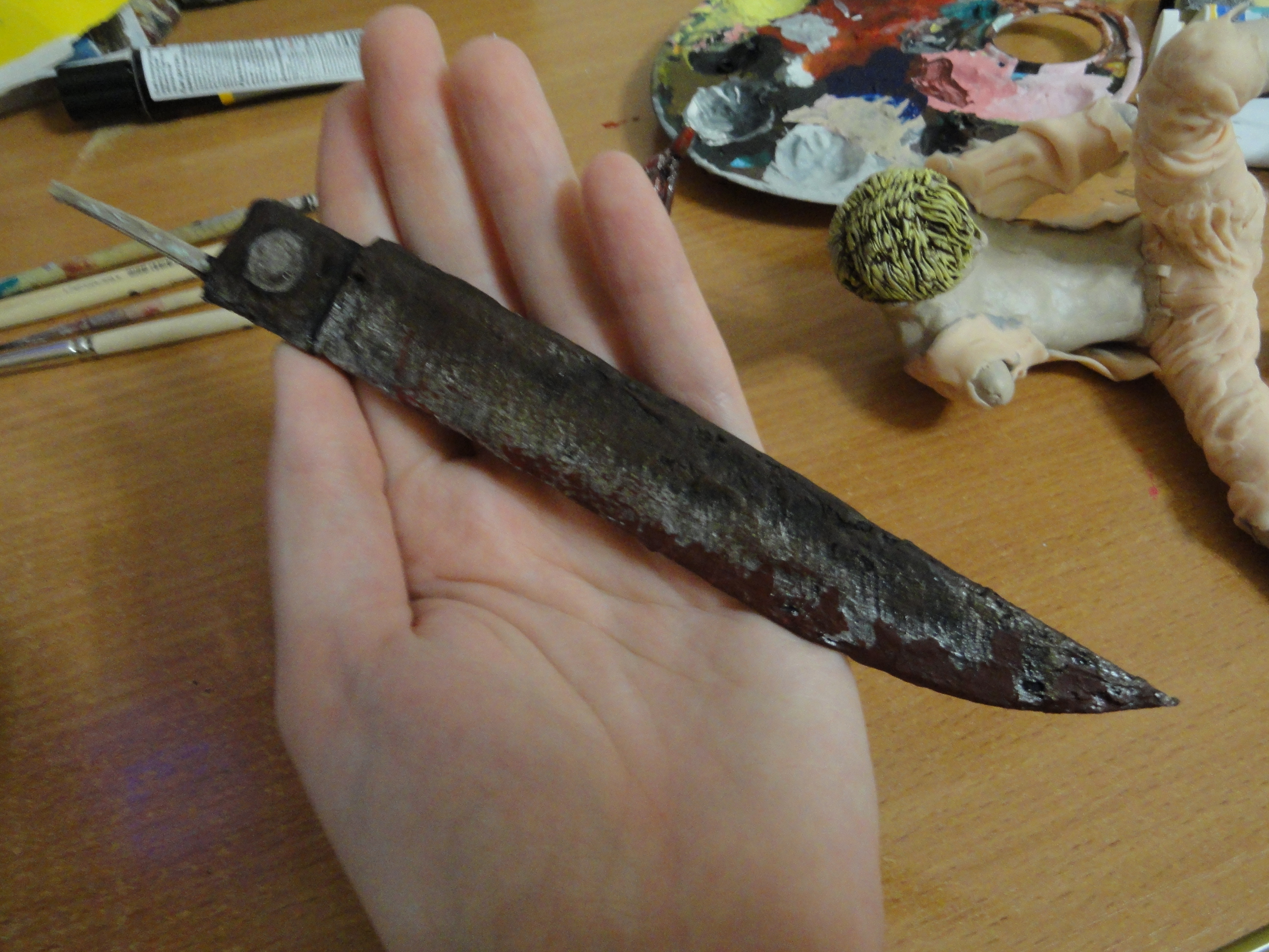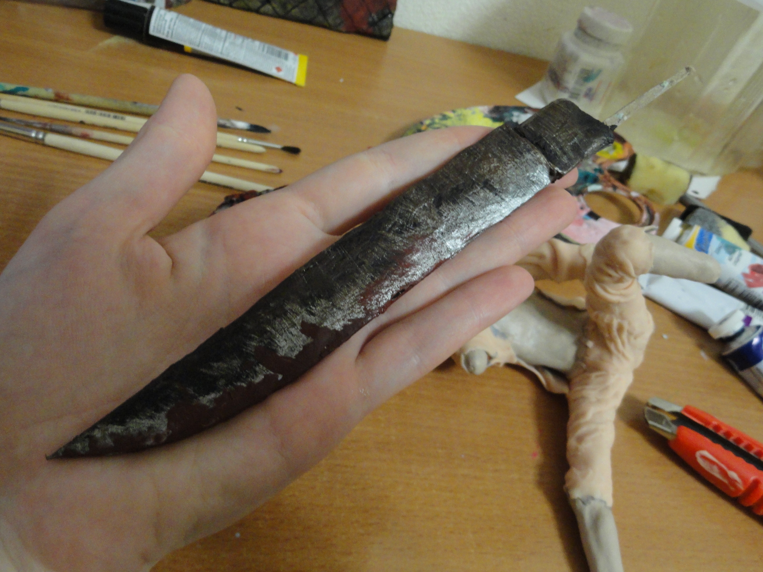 Тесак и пирамида сначала были картонные, потом я их обмазал слоем эпоксилина и покрасил. Нож - черной краской, потом губкой нанес серебряный акрил, потом коричневую ржавчину и кровищщу. Пирамида сначала была темно-коричневая, потом я ее покрасил в красный широкими мазками кисти, потом кое-де добавил серебра.