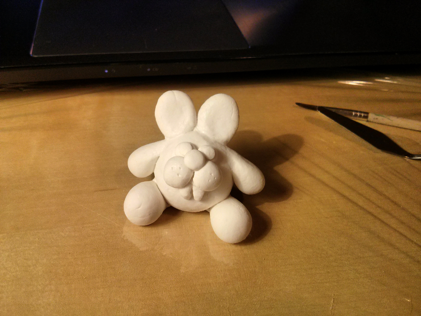 Вообщем, решил потестить, что это за материал такой, и слепил первую в моей жизни фигурку - стремного зайца. Возникли такие вопросы: как и сколько его сохнуть (на коробке инфы не было)? как ускорить процесс сушки? может феном попробовать? в видео на ютубах говорят, что для склейки деталей их нужно мочить водой. почему у меня детали скорее скользят, чем клеятся с водой? очень тяжело было лепить уши, например. как работать с мелкими деталями? например, нужен прилепленный маленький шар, но если его начать клеить - он определенно расплющивается. как бороться с налипающей пылью (мелкие волоски, черные точки и пр.)?