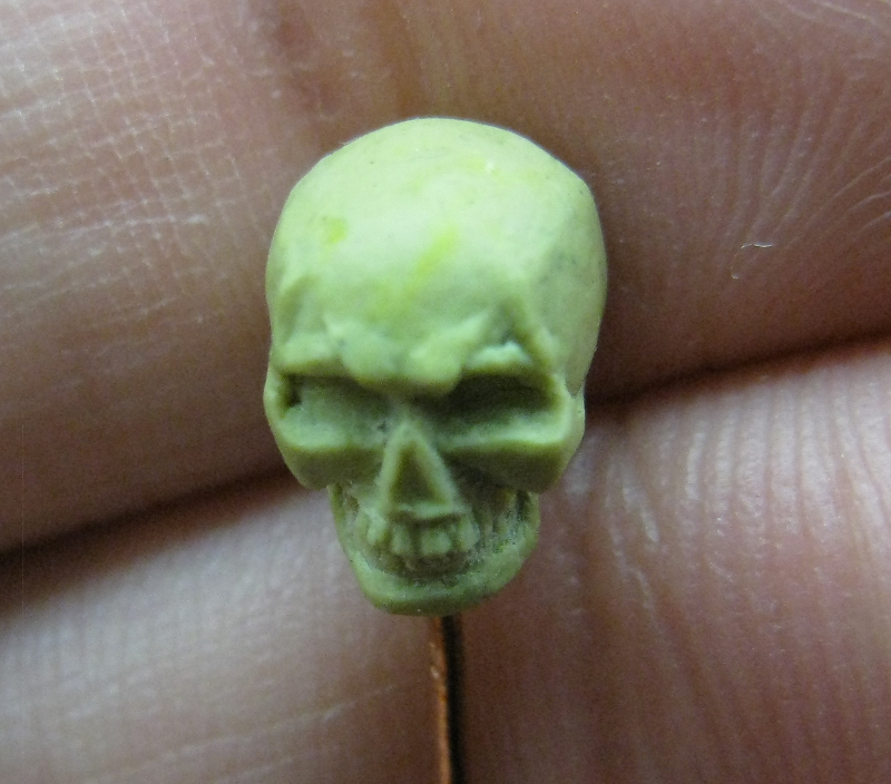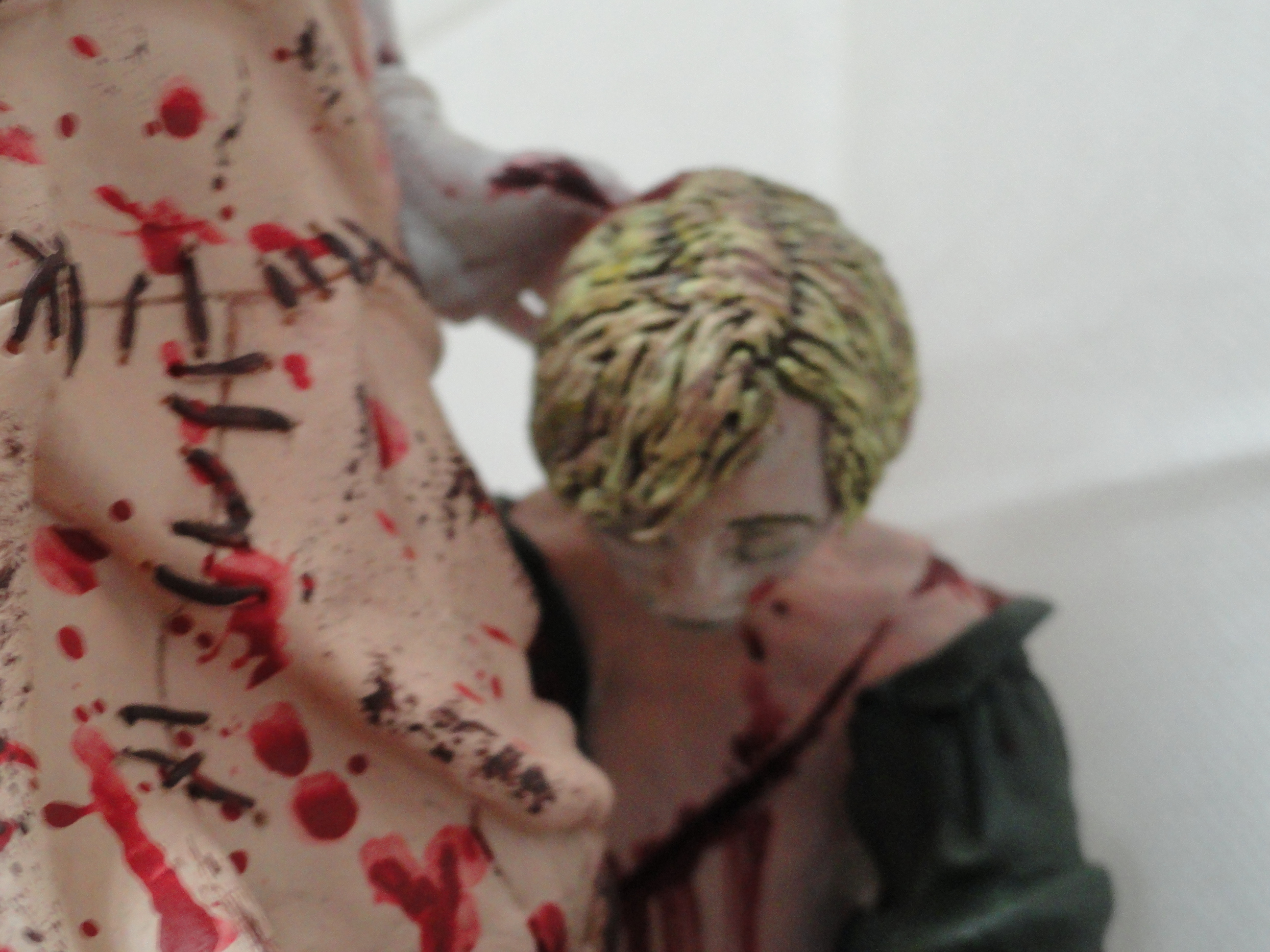 Юбко-фартук покрасил в бежевый цвет, потом добавил брызги крови вольными махами кисти. Тесак прикрепил в руку тем же эпоксилином, ручку покрасил так же, как и тесак. Долго добивался нужного цвета кожи Джеймса. Вот его лицо. Очень сложно сфотографировать так, чтобы оно попало в кадр.