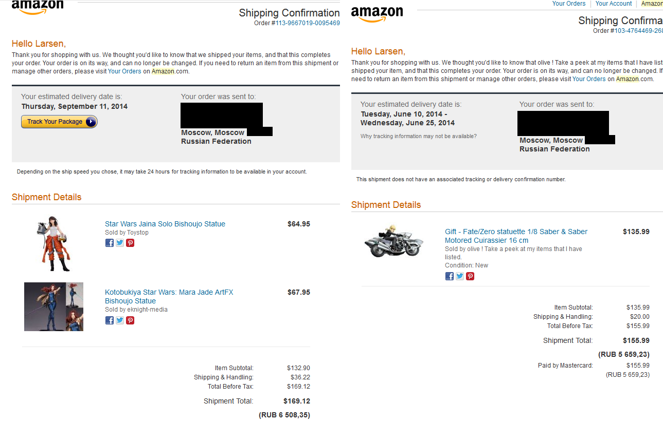 2. По поводу обычного САЛа на амиами. Все мои немногочисленные фигурки я заказывал только емсом (один раз потеряли посылку, но деньги амиами вернул в виде бонусов). САЛ идёт без страховки. То есть, если посылку потеряют, то нет смысла писать ни магазину, ни почте?