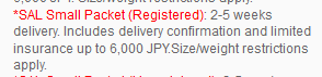 >>18402 >регистред сал по цене от ЕМС почти не отличается. Ты путаешь SAL Small Packet (ограничение до 2 кг в общем случае, до 5 для печатных материалов, может быть регистеред (с трекингом) и анрегистеред) и SAL Parcel (до 30 кг, всегда с трекингом). Регистеред сал отличается от анрегистеред на 410 йен, и всегда в ~2 раза дешевле емса. А парсел на малых массах дороже емса, а на больших - дешевле.
