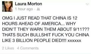 >>19020 Здесь должна быть еще картинка со скриншотом поста какой-то девушки, которая ненавидит китайцев за то, что при всей разнице во времени они не предупредили американцев о том, что 11 сентября в башни врежутся самолеты, но картинку просрал, английский для поиска среди ночи не работает.