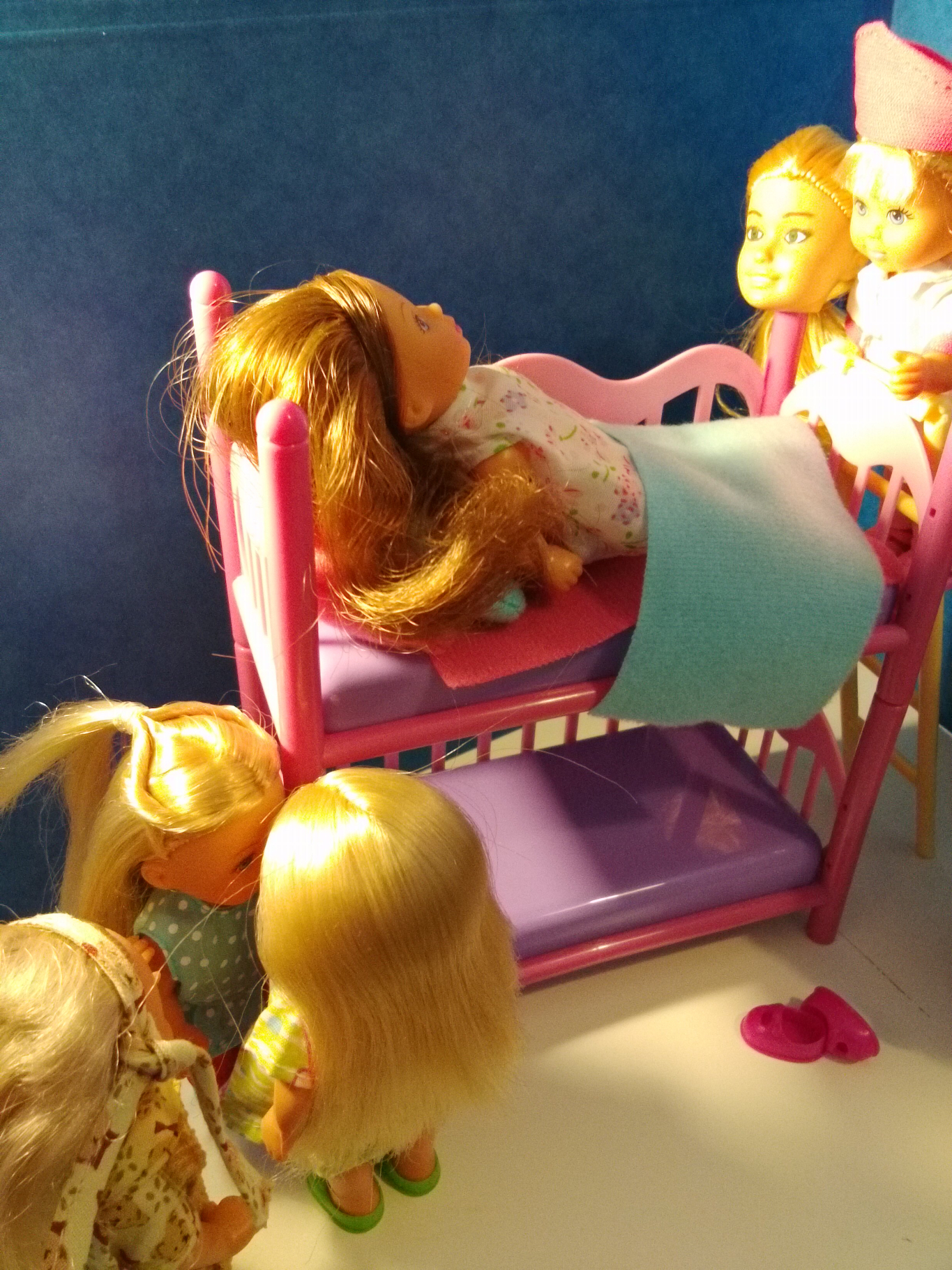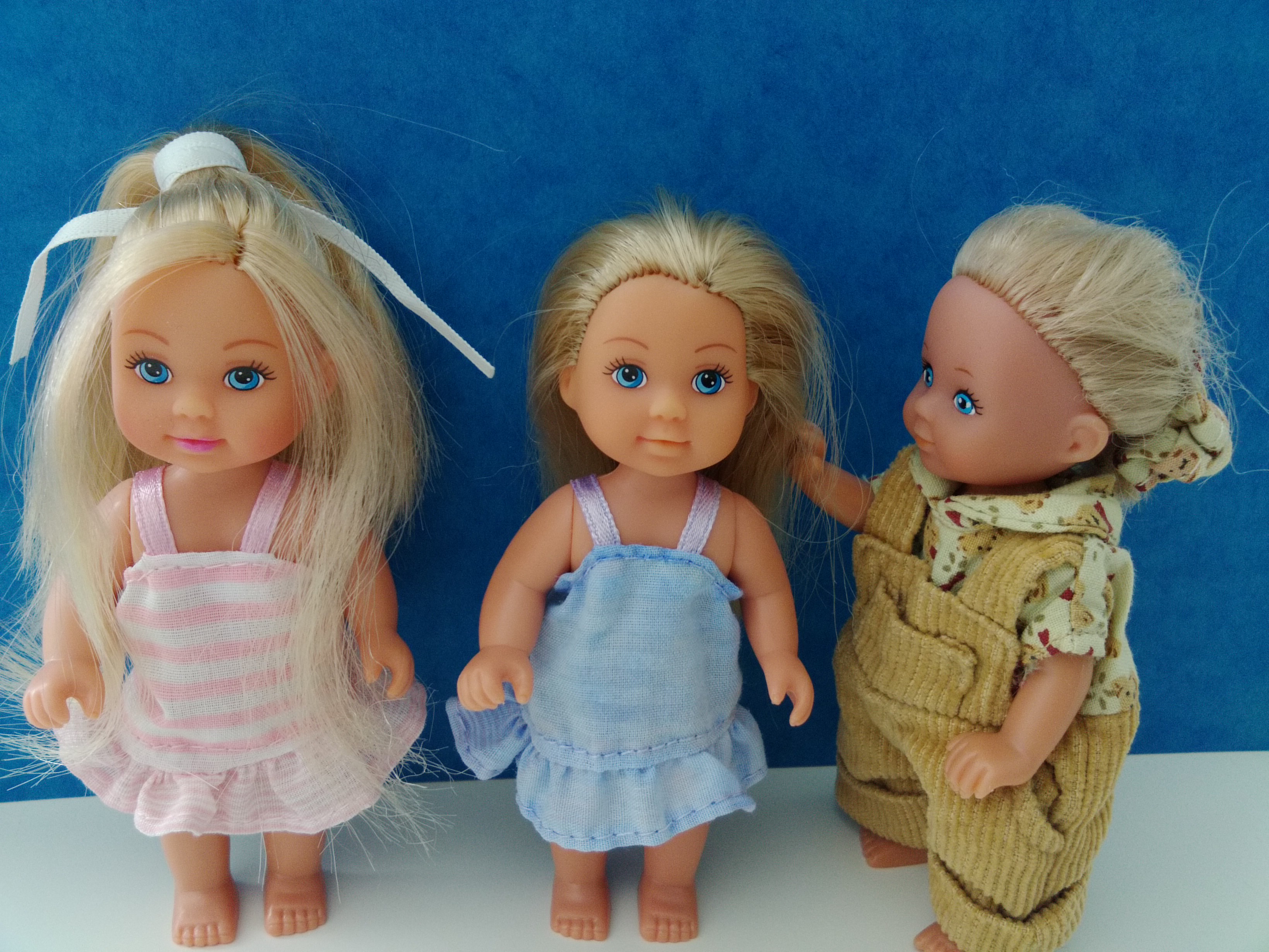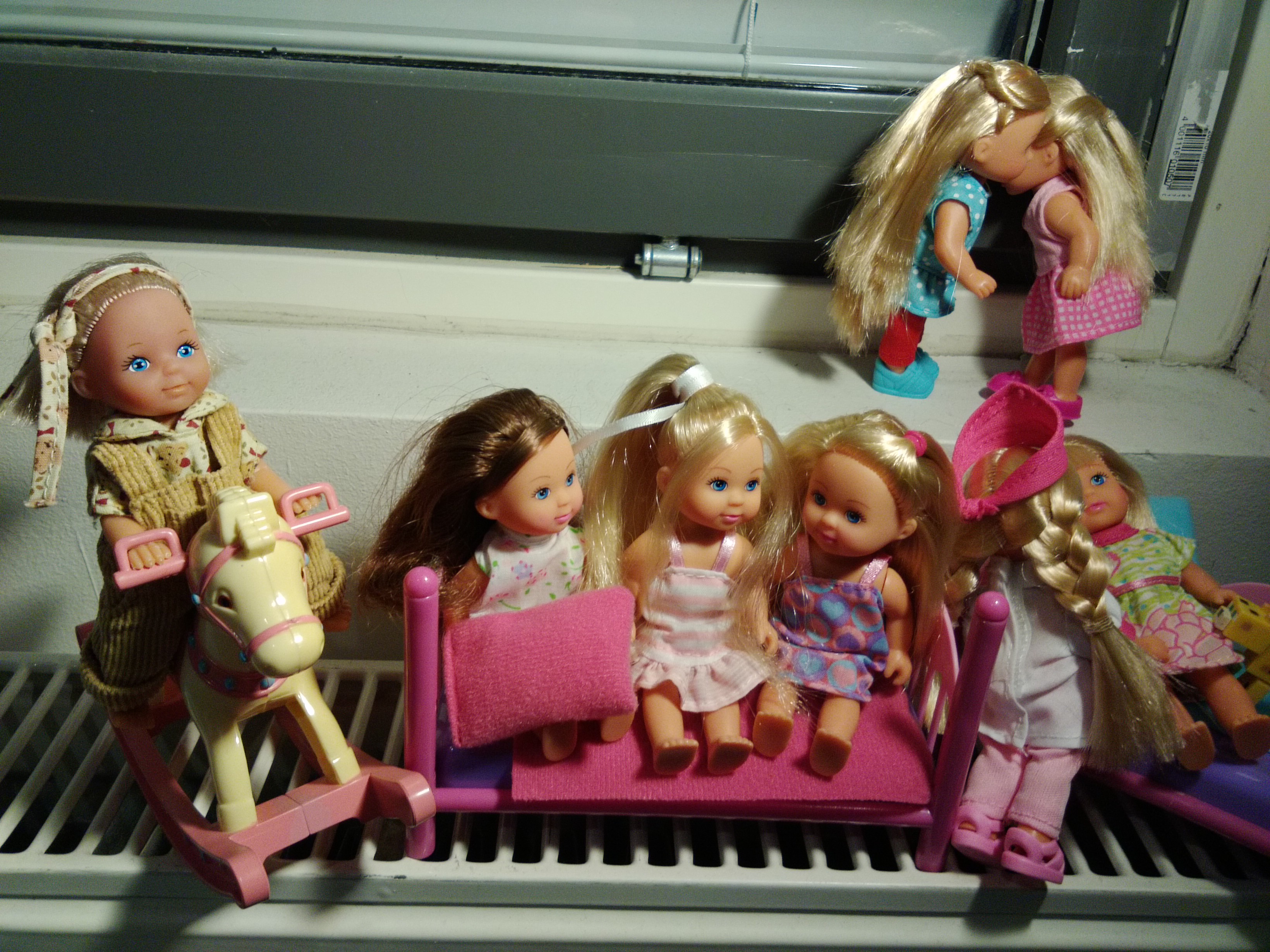 1. Мне случайно попалась статья о Tree Change Dolls. И видео. Перерисованные лица вызвали теплые радостные чувства. Смутно захотелось себе милую живую куклу. 2. Следующий эпизод - в блуждании среди инфы о куклах наткнулась на Момоко, влюбилась в эту: http://www.momokodoll.com/lineup/dl96.php , а потом и в эту: http://www.momokodoll.com/lineup/dl146.php65 и 136 тоже немного вдохновили Решила, что если через неделю-две не передумаю, то закажу Ethnic Flower (знаю свою особенность внезапно чем-то вдохновляться, и быстро остывать. не хотела ненужную куклу.. Через неделю-полторы я почувствовала отторжение от кукольного лица Ethnic Flower. Поняла, что так случится с любой красивой куклой. Еще отторжения добавило копошение продавцов вокруг этих кукол. Да, я могу заказать эту момоко за 100 долларов + доставка, т.е. проблема не в том, что "слишком дорого", но общая атмосфера вокруг продажи серии момоко (и прочих красивых дорогих кукол) мне стала слишком противна. К тому же, момоко уже достаточно красива, чтобы я побоялась ее перерисовать своими кривыми руками. Поэтому решила начать с дешевых игровых кукол. Особенно с тех, которые у меня были в детстве. Simba Evi Love. 3. Заказала несколько Evi с амазона (я не в РФ, тут с этими куклами в магазинах на удивление плохо, хотя они и игровые. Хотя можно заказывать на сайте магазина. Зато на амазоне большой выбор и довольно дешево.) 4. Пока эти трехмерные схематические изображения личностей ехали с амазона, я купила еще двух. 1 - подержанная evi на местном авито (у старых evi другое лицо, мне оно нравится отсутствием макияжа. и о детстве напоминает, дома такие лежат.) 2 - рандомная кукла Defa Lucy из местного супермаркета. Плюс акриловые краски и 5/0 кисть. И даже ацетон из аптеки. 5. Несколько часов напряженной непривычной работы и поправления ляпов привели к результату. Кисть все же оказалась недостаточно тонкой (в магазине не было тоньше), поэтому нарезала щепки из спичек. И очень не хватает коричневой ручки для рисования ресниц-бровей. Конечно, по-сравнению с профессиональными ООАК это можно назвать мазней, но мне приятно на нее смотреть. Хотя окончательно оставлю из всего этого только зубы. Остальное пререрисую, когда куплю тонкие кисти и коричневую ручку для ресниц. 6. Мне приятно было расчесывать evi, смотреть на них, создавать из них композиции. Но играть как в детстве было не очень интересно, хотя и вспомнила, как это. И все же меня радует их присутствие. Думаю постепенно в выходные учиться перерисовывать их лица. И то не каждые выходные, по настроению. 7. И теперь вопрос, который меня мучает: зачем мне куклы? Неужели так приятно видеть модели личностей? Похоже на то... Но зачем, почему куклы? И еще в мелких куклах приятно то, что их можно завести довольно много, и делать с ними интересные композиции. Например, нарядить их в одну форму. Пока хочу организовать медицинское учереждение, похитившее девушке для практикования комплексных операций на личностях. Даже медсестра уже есть, - мой первый ООАК.