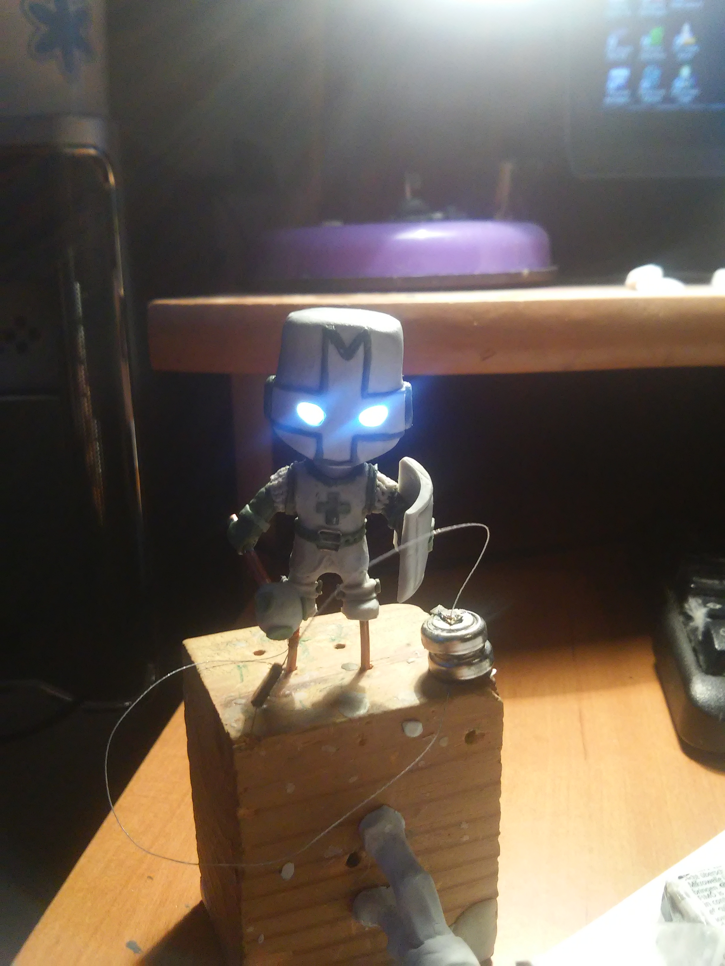 >>25169 Cпасибо.Светодиоды размер 0603(по факту можно больше), сначала делал "лицо" потом запекал его,спаянные с проводкой светодиоды залепил в типа прозрачную пластику от фимо, опять запек, и дальше доделывал все остальное.