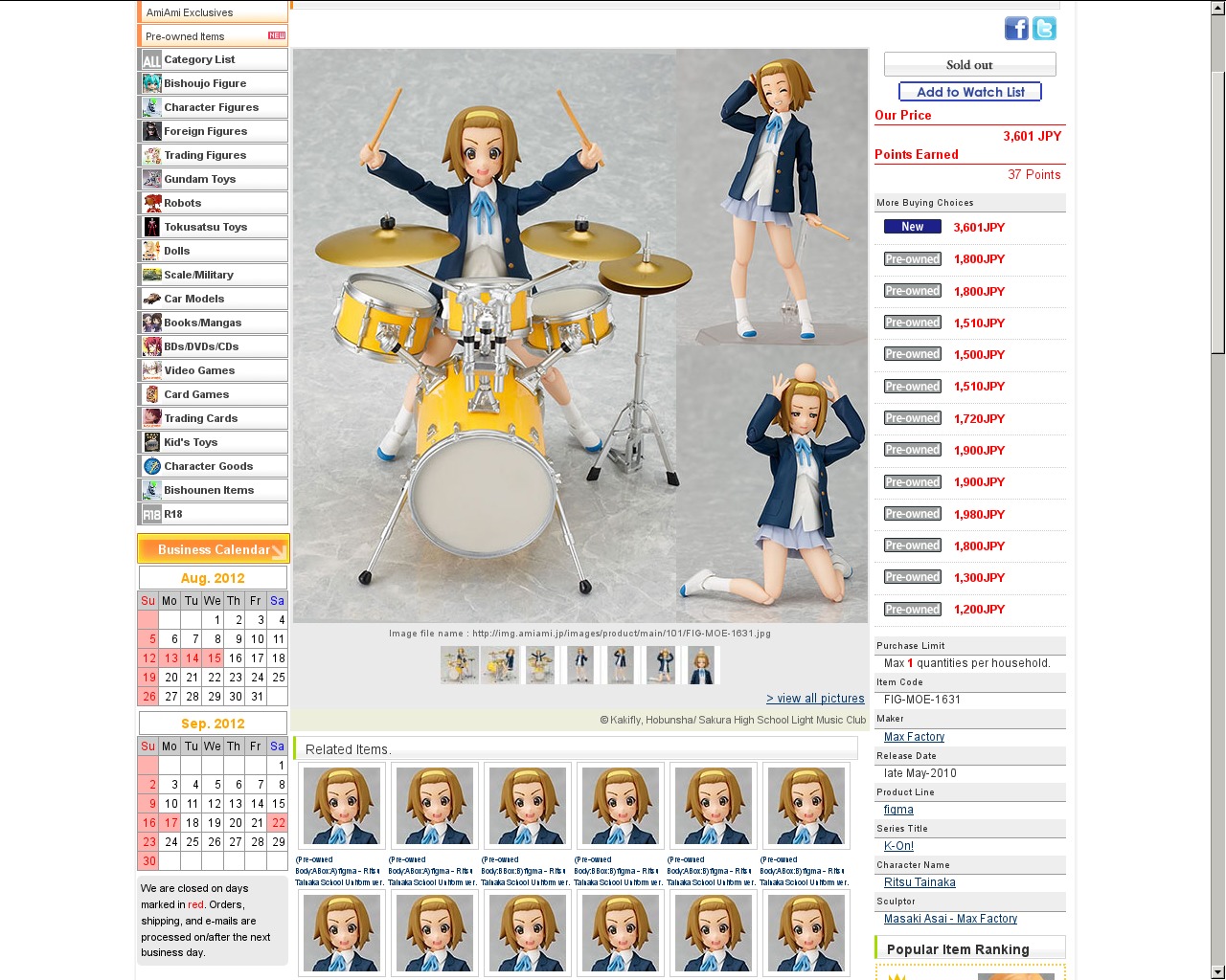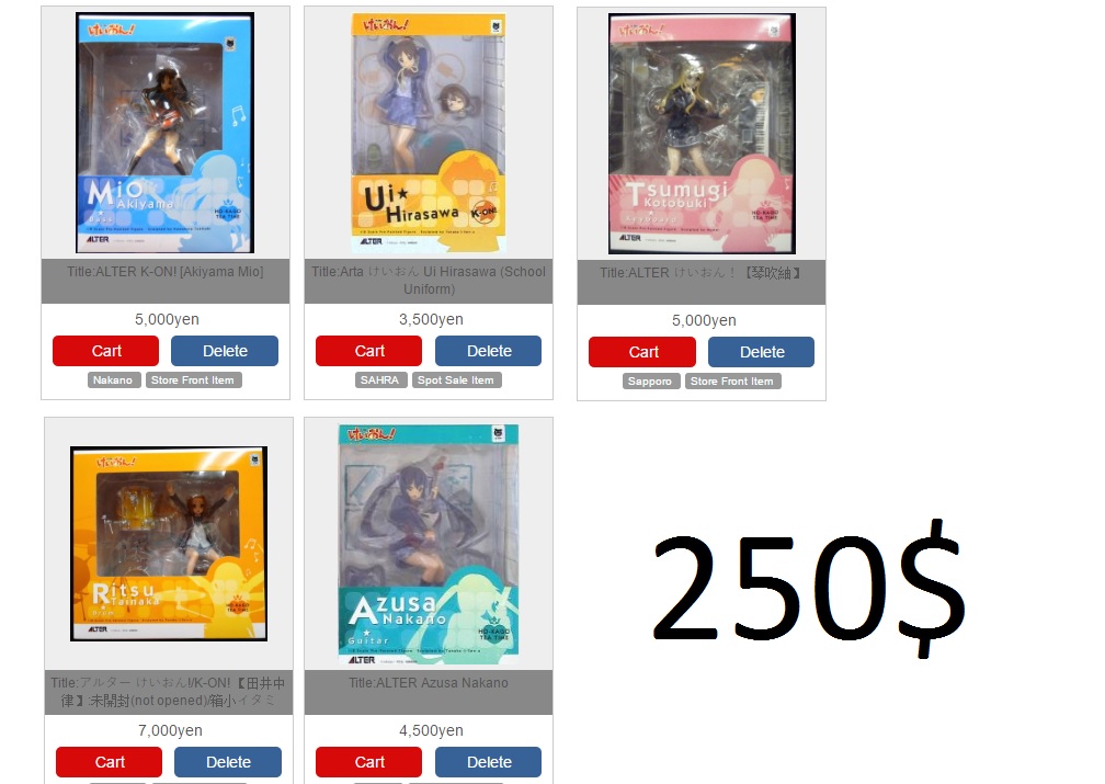 Ну и опять же, может и не 700, но комплектец обычных точно под 600 баксов выйдет. Вот, в Мандараке есть все анопенед кроме Юи (есть только опенед, но вполне вероятно, что вбросят и анопенед, я так сегодня выцепил Харухи, хотя пару дней назад нихуя не было в наличии) и кроме Нодоки (но она есть на plamoya за 32 бакса. Получается, если удастся выцепить Юичку за полтос - за все про все 332 бакса. Если нет - придется брать где-то за 75-80 баксов. В итоге все реально встанет в 350. Ну и плюс доставки-хуявки, куда без них.
