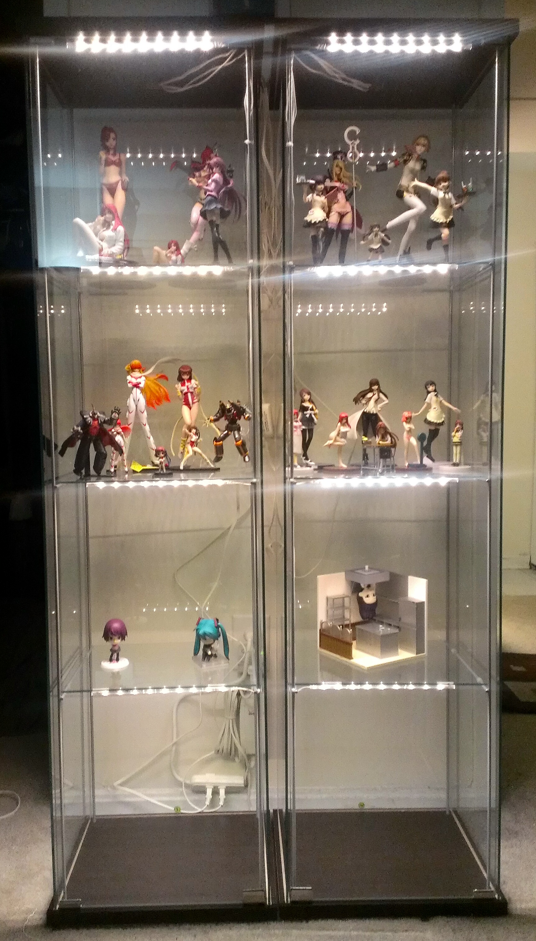 Пропустить ленту по всей витрине не представлялось возможным, резал отдельные куски от одного крепления полки до другого, между отрезками был провод 3-4 см длинной, всего таких отрезков было 11 штук. Потом еще пустил ленту по верхней наружной поверхности витрины. Клеил этим самым жидким пластиком, держит он хуево, но в случае чего можно будет убрать все это к хуям. Витрина с подсветкой выглядит на порядок лучше, чем без, просто блять в 10 раз лучше. У меня еще есть ящики на стенах, планирую заказать теперь уже с али всей необходимой дребедени и заморочиться по хардкору.