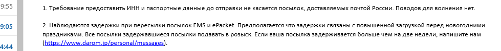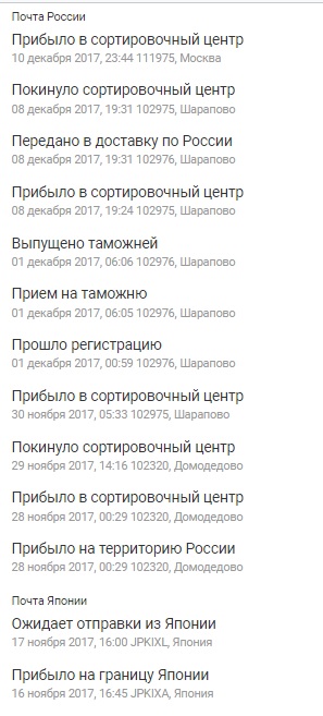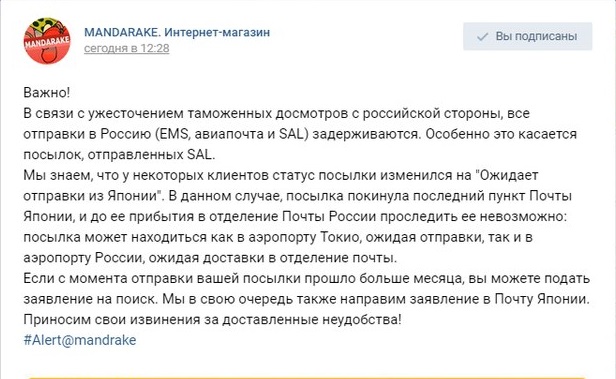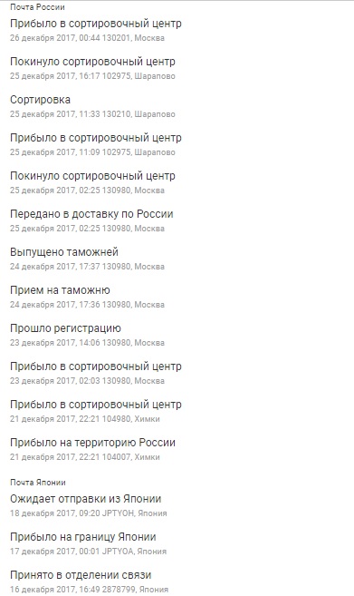 >>29035 Последний раз моя посылочка проходила нормально только в ноябре (за три недели в ДС). Дальше пошло говно. Но что утварили сейчас (с этими "ожиданиями отправки") - такого никогда не было. В ДС из Японии приходили посылки на таможню за неделю-полторы, а тут месяц - и нихуя.