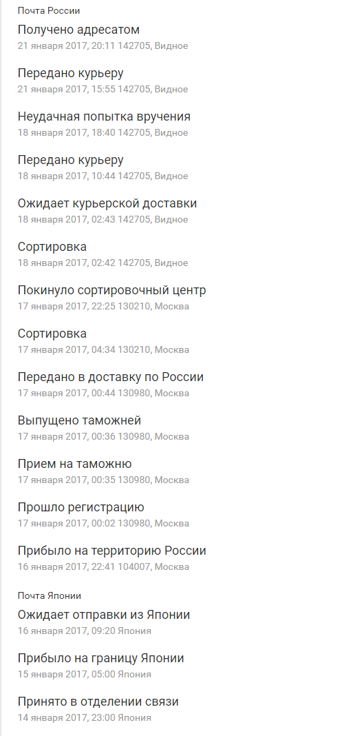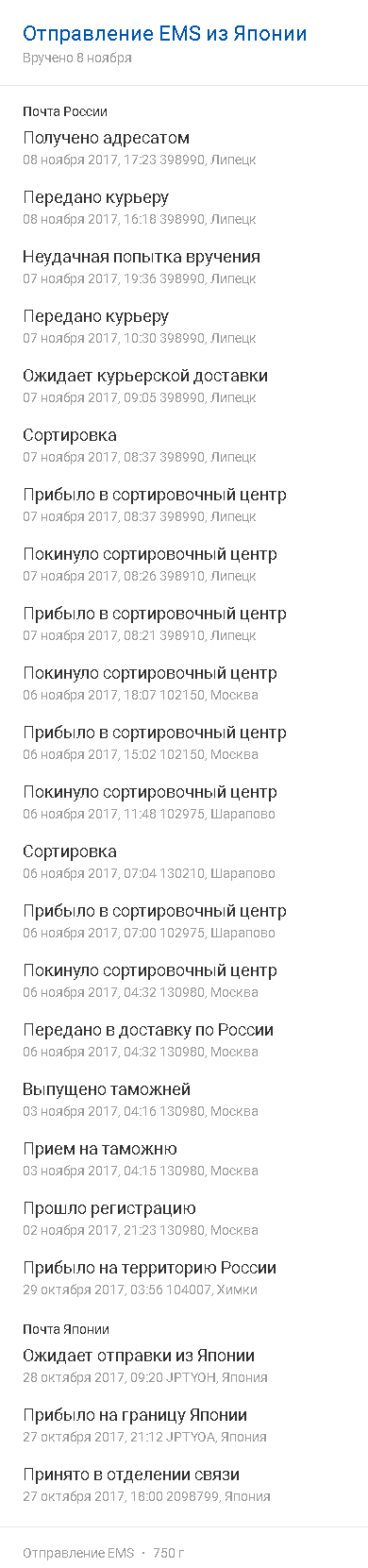 >>28921 Это который без страховки по Японии? На я читал, что теряется около 1-2% посылок. Если же в РФ из Японии, я один раз брал безтрек несколько лет назад, доехал нормально, но очень долго это было. Вообще - ты видишь ситуацию на почте РФ сейчас - таможня перегружена, с декабря посылки еще не прошли - это увеличивает риски потери, но дело твое, безусловно.