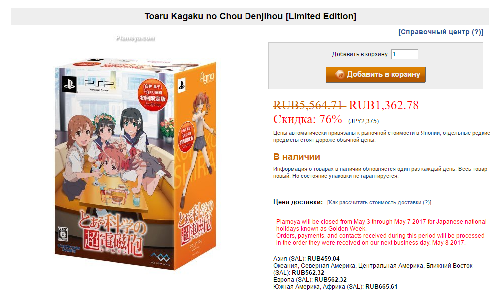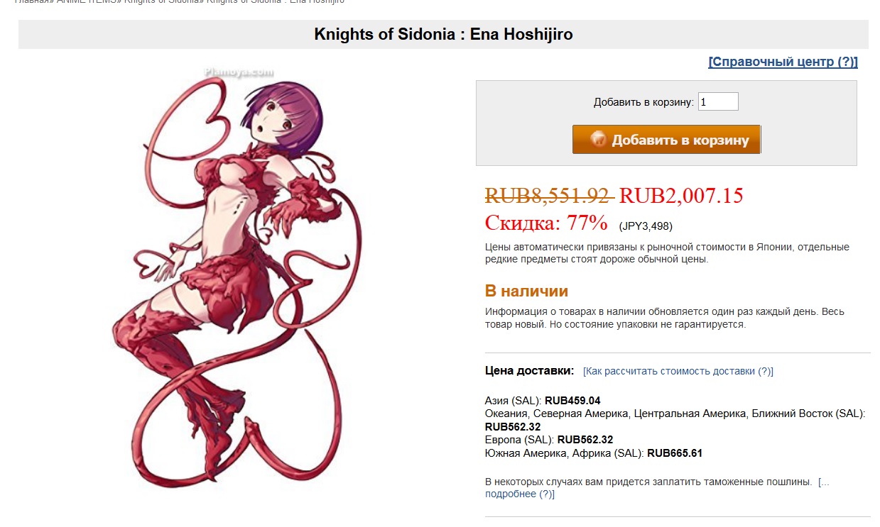 >>32124 Да нет там никаких удорожаний в разы. За анимефигурки.ру не скажу, а вот на ноданоши цена вполне себе коррелирует. Да и чего бы ей не коррелировать, если при определенных условиях сам ами дает скидки на большие заказы и можно договориться с почтой о весьма существенной скидке. По опыту, если не гоняться за редкими вещами, то весьма редко сильно разнится прайс между заказами из Японии и России, рынок решает.
