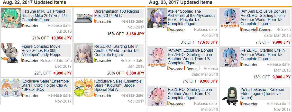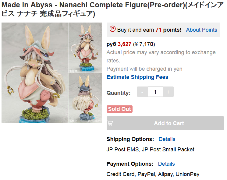 >>28901 >есть смысл ждать и мониторить Смотря какая дата выхода у фигурки. Если разобрали предзаказы, то 100% что сможешь урвать прямо после релиза, потому что там пойдут отказники, не проплатившие вовремя заказ. Если популярная фигурка релизилась год назад, то иногда выставляют подержанные, но на манде больше. >сайты по типу мандараке и амиами http://www.biginjap.com/ http://www.1999.co.jp/eng/ Есть ещ соляра, но что-то хуй знает. Подозрительные они. Предлагают даже древние фигурки типа новые за много денег. Откуда?