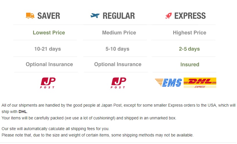 >>32108 >Сена, а как насчёт заказов с Суругае? Такая-то кладезь товаров, да и цены во многих случаях ниже, ассортимент больше Правда дело в том, что фигурки там сугубо преовнед. А так всякой мелочевки хватает конечно. >но вот с заказом непосредственно самому клиенту траблы. Там на каждой страничке товара есть хуйня пикрелетейд - кликаешь по ней и оформляешь. Правда там вроде только ЕМС был, так что получился дороговато. >Приходится искать окольные пути. Скоро опишу в ФАКе подробнейший мануал как для даунов-аутистов как заказывать через один из самого из простых и дешевых форвардеров со всеми подробностями начиная с регистрации у форвардера и заканчивая заказами.