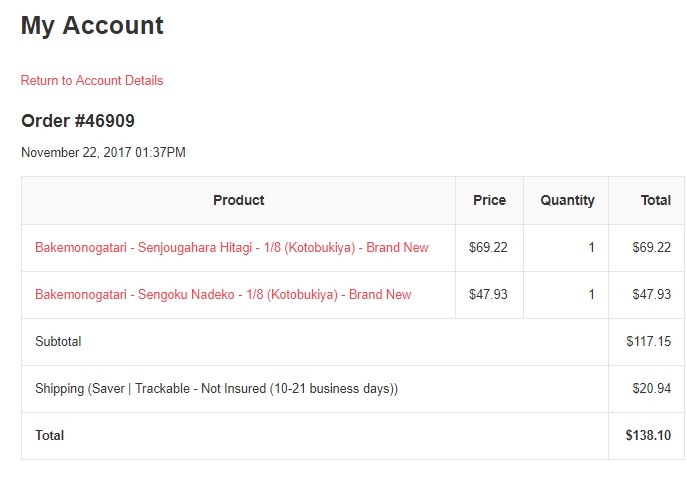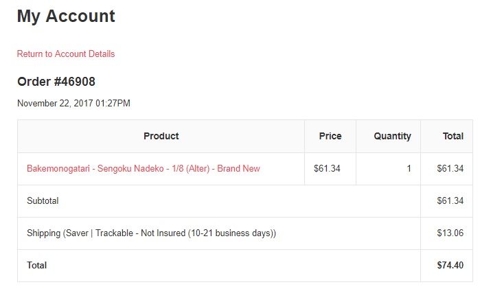 5.12 - amazon.co.jp - 220.80$, сюда же нужно включить оплату за форвардинг в 18.64$, всего 239,44$ за одну фигурку (но зато какую!). 5.12 - solarisjapan.com - 92.14$. 14.12 - mandarake.co.jp - 980.10$. 22.12 - solarisjapan.com - 86.13$. 25.12 - solarisjapan.com - 55.07$. ИТОГО 1452.88$ Ящитаю, неплохое завершение конца года. Конечно, вы можете ничего не отвечать мне, но я знаю, что пердаки у вас изрядно подгорают от моего успеха.