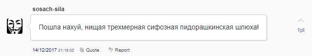 >>32285 >Нехуй тут пиздой светить! Вот и я к чему. Кто фотки хочет показать - тот покажет и заслужит похвалу/обсирание в зависимости от ситуации, но не будет устраивать блядский цирк, выпячивая свою половую принадлежность и создавая вокруг себя кружок дегенеративных пиздалисов, которые превращают дискуссию в ебанное говно, потешая эго шлюхи. И это не только по отношению к конкретной шлюхе в конкретном треде - везде, в любом треде нужно поступать аналогично, кормя мразей вербальными немытыми хуями чтобы сыбали.