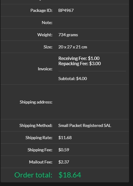 Отправил. Ось таке застоило. Надо понимать, что я заказал переупаковку за три бакса, т.к. коробка была для внутренней почты Японии, а там не такие пидорасы как у нас и посылками в футбол не играют, потому упаковка весьма скромная и без всяких там уплотнителей. А рисковать фигуркой за 220 баксов, сэкномив три - это как-то слишком. Можно будет заказать какую попроще и без переупаковки переслать и посмотреть что дойдет. Кстати, приятно, что когда переупаковали сделали еще одно фото. Из платежей не очевидный был только "Mailout fee", который в условиях описан как "We add a mailout fee of $2.00 + $0.50 per kilogram on each package we ship." Я думал что до кило два бакса а там +0,5 за каждый сверху, а оказывается что два бакса в любом случае + всегда идет расчет за вес, т.е. так как у меня посылка 734 грамма, накинули 0.59$ еще.