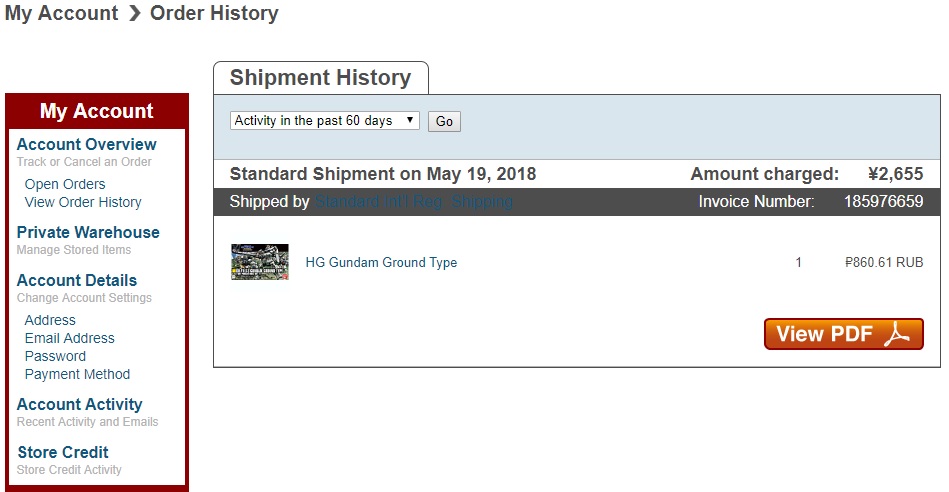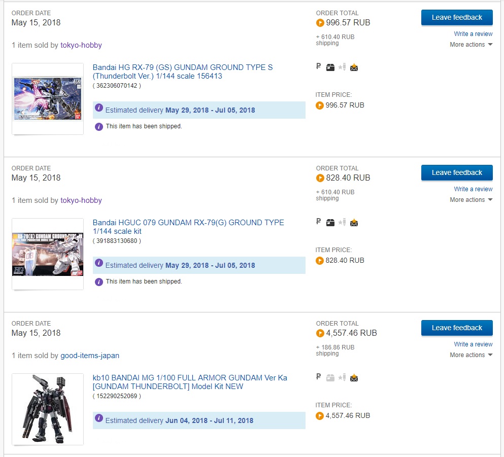 >>39278-кун на связи. Сделал второй заказ с 1999. В общем, методом перебора выяснил что за 990 йен можно заказать две стандартные HG-коробки и неограниченное количество мелких пакетиков типа декалей/фототравления/запчастей от котобукии/etc., но на сумму не больше 60 долларов. При превышении лимита по стоимости на одну коробку или по сумме стоимость становится 1440, потом 1940, потом 2400, и потом 5800. При этом при попытке заказать RG стоимость доставки сразу становится 2400. Вывод: наебать систему не получится, но заказать пару гандамов за тысячу рублей, которая превратится в 1300 в Москве вполне реально, что для меня норм.