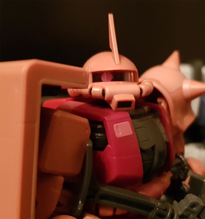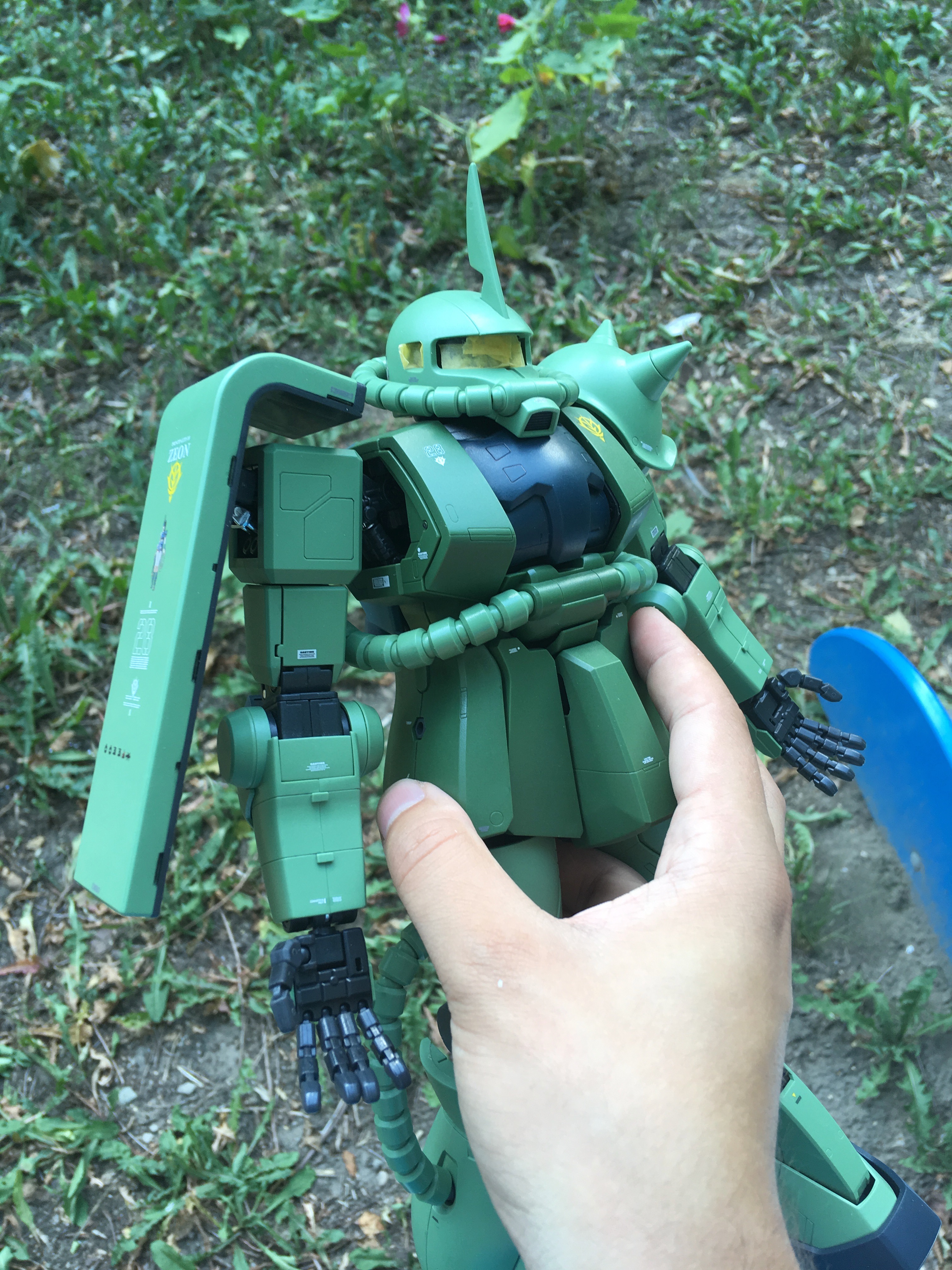 RG Заку просто отличный, собрался за один день. Очень понравилась идея с движением окуляра: двигаешь голову - "глаз" поворачивается в эту же сторону. В обзорах видел, что у других Заку нужно было снимать голову и сдвигать маленький рычажок снизу. Наклейка из комплекта не понравилась, так как она слегка больше детали и потому по краям загнулась, что портило вид. А самое весёлое то, что нашёл у себя в загашнике краску 1 в 1 совпадающую со цветом "глаза", что позволило сделать всё аккуратней.