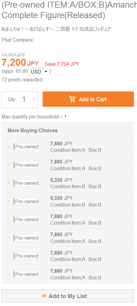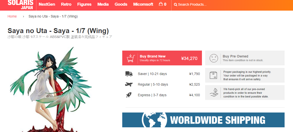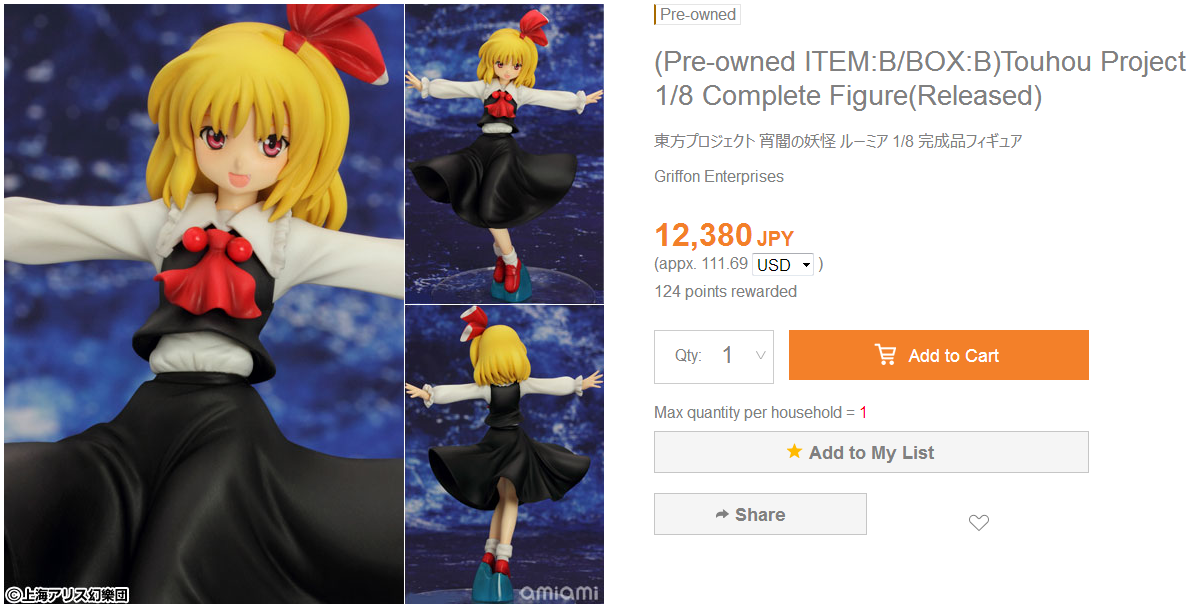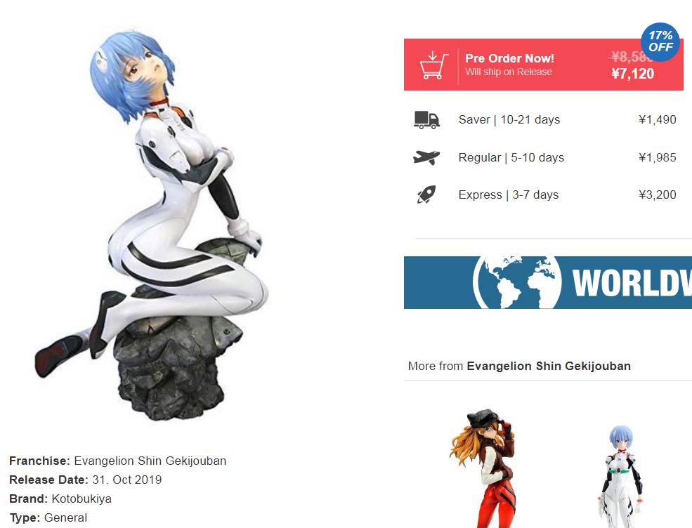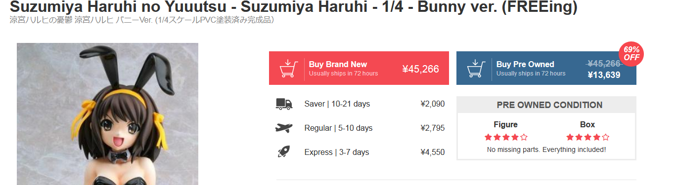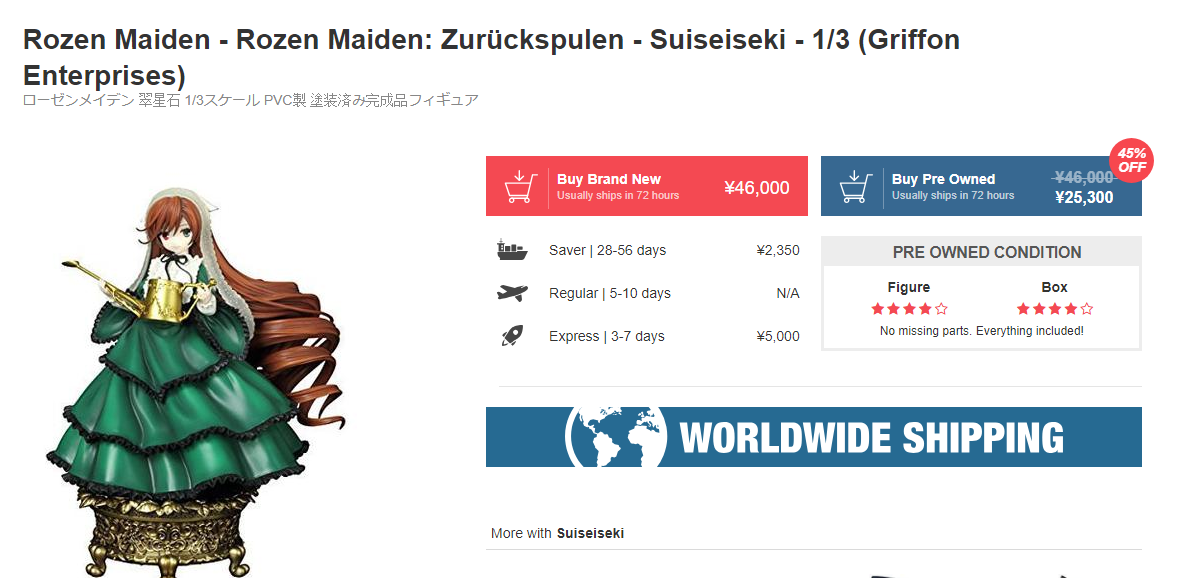 >>42265 В среднем, ценник на новую и подлинную фигурку 1/7 масштаба сейчас болтается на уровне 12000 йен или 7000 рублей (без учёта доставки). Тут всё зависит от следующих факторов: