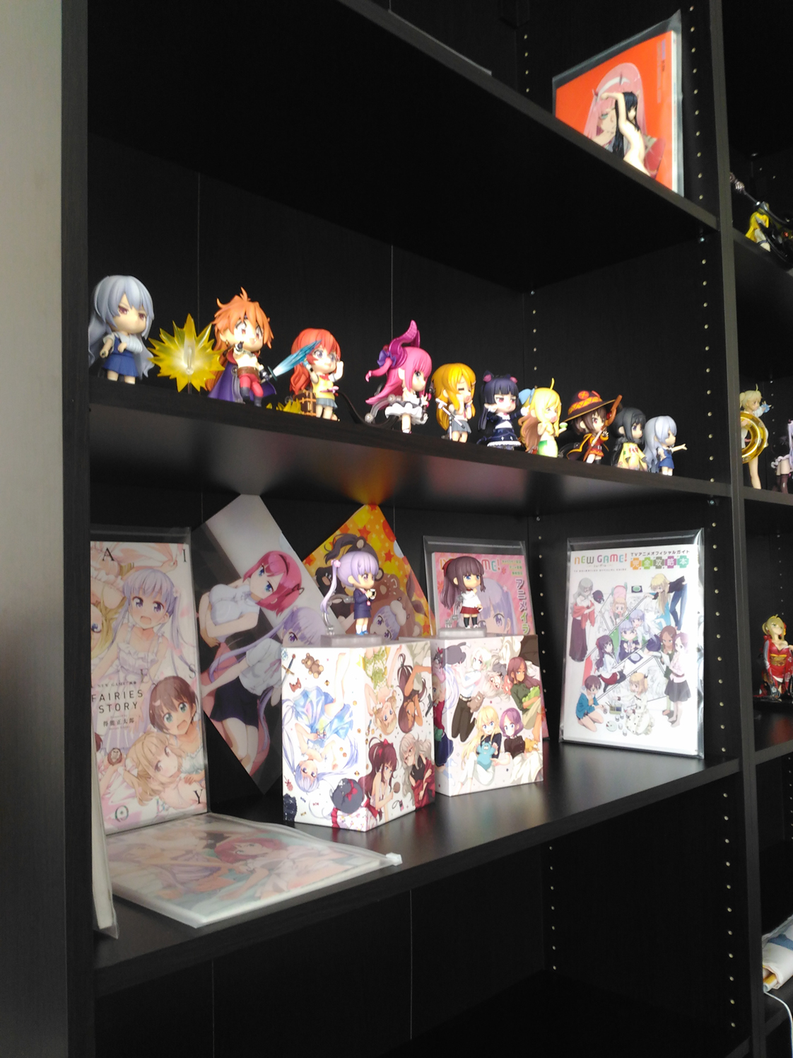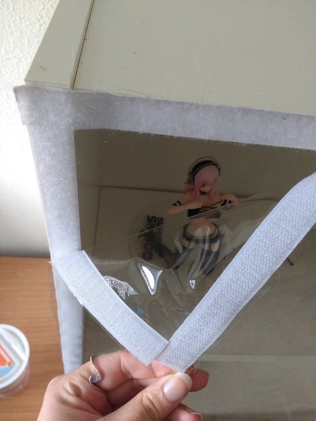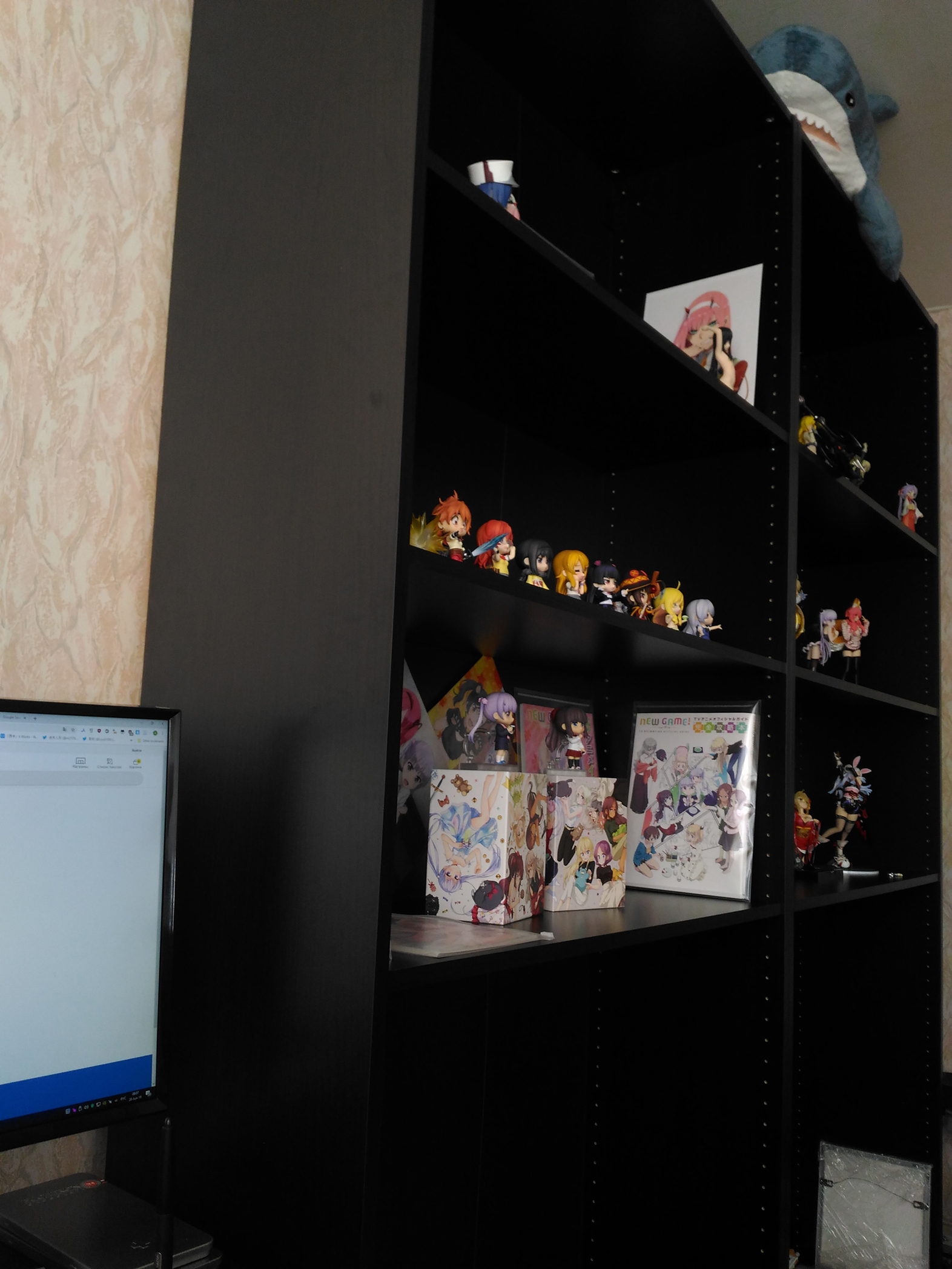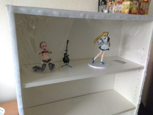 - К высокой верхней полке (184 - 237см) напрашиваются 1/4 зайцедевки. Или ещё одна мини-полка в 1/2 глубины. - Для нендороидов заказал "лесенку" из пластика по всей ширине полки. Будут стоять в 3 ряда. - Думаю о подсветке. Поиски светодиодных лент с CRI=95 уже приносят боль. - После подсветки попробую запилить заглушку из цельного листа оргстекла к одной из полок. Видимость должна быть хуже обычного стекла, но идея привлекает дешевизной и лёгкостью реализации. Делать стеклянные двери точно не собираюсь.