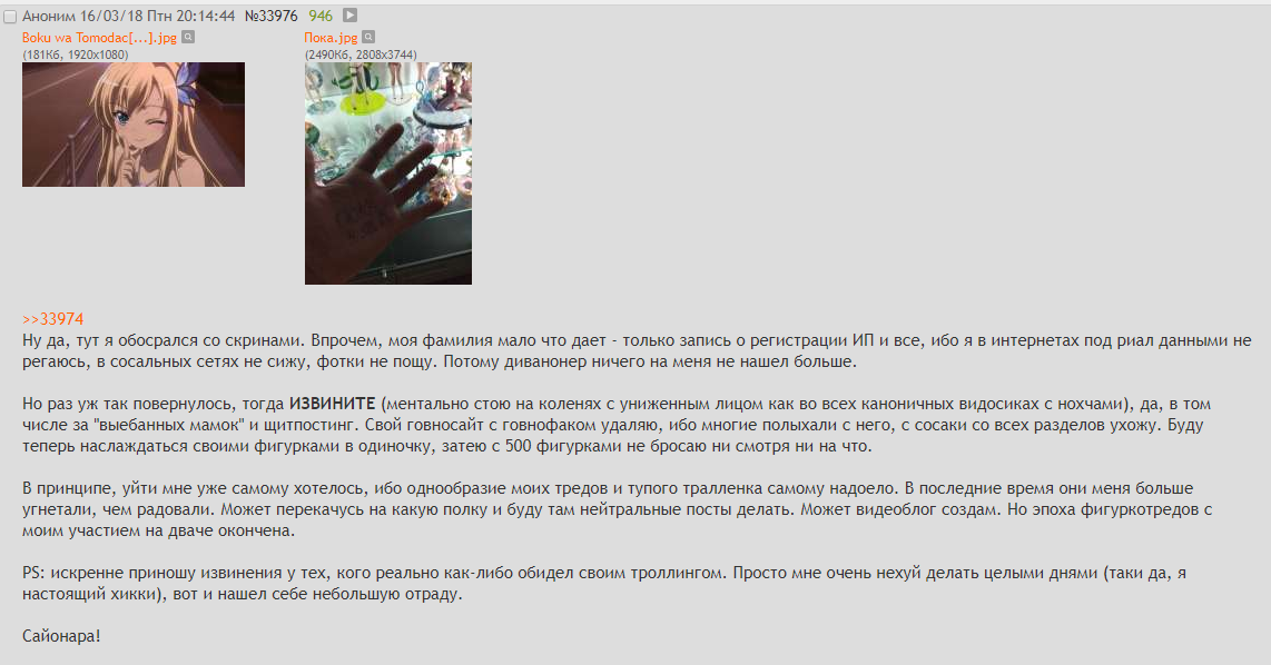 >>42650 Ну, мы с другом собираем. Правда он очень редко покупает что-то, но есть с кем обсудить. Родители и бабки знают, им нравится. Я начал собирать, когда ещё с мамкой и батей жил. Мамке некоторые прям очень заходили. Она даже уговаривала меня найти и купить фигму Годоки, лол. А батя у меня молчаливый, просто подходил, смотрел на обновочки. Одна бабка назвала фигурки "произведениями искусства". Сейчас иногда присылаю фото с новыми фигурками мамке, если она спрашивает. Только ей абиссалы из Кантая не нравятся :( Говорит, что они бледные и страшные, а у Ре-класса "геморрой какой-то с зубами".