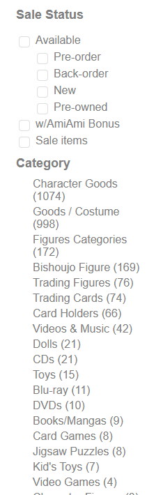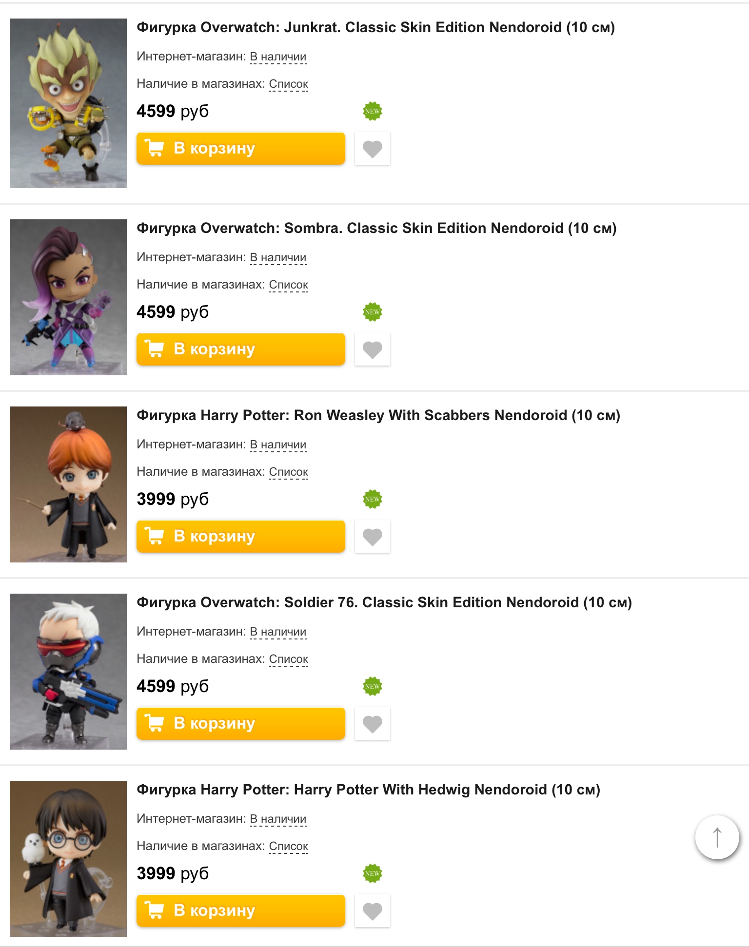 >>44862 1,2) Что вот это говно делает в категории фигурок персонажей 3) Почему нельзя отдельно отобразить фигурки которые продаются со скидкой, но у них нет плашки SALE 4) Где нормальная сортировка товаров, по цене, скидке, категории етц.